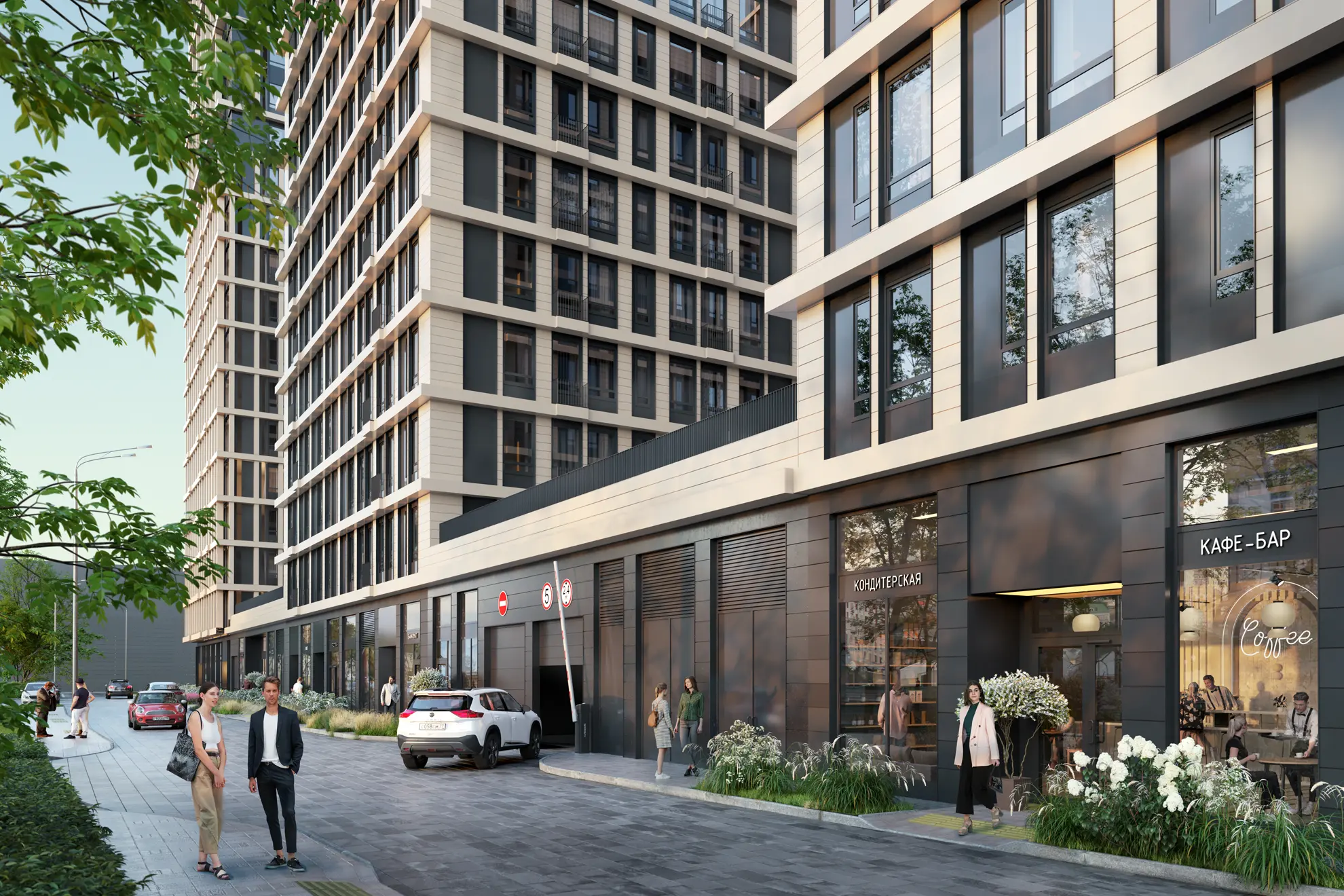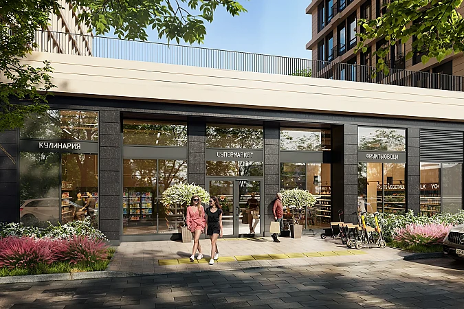На первых этажах комплекса представлены коммерческие помещения площадью от 26 до 302 кв. м. Каждое помещение имеет отдельный вход, витринное остекление и возможность гибкой планировки. Здесь можно открыть супермаркет, кафе, офис, магазин или предприятие сферы услуг. Высокий пешеходный трафик обеспечивается благодаря близости жилого комплекса и будущего крупного общественно-делового квартала.