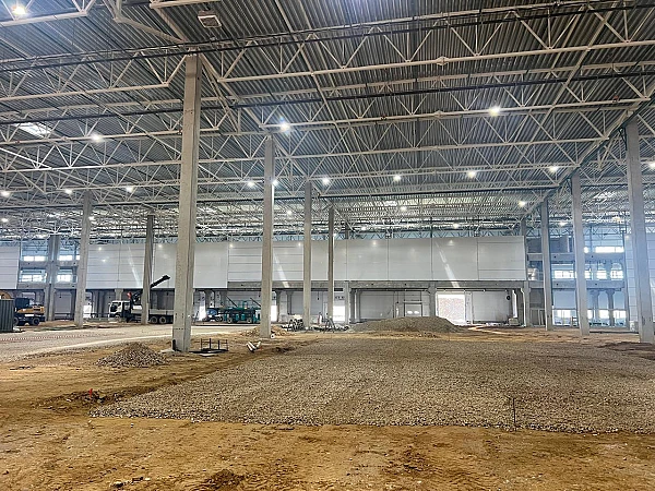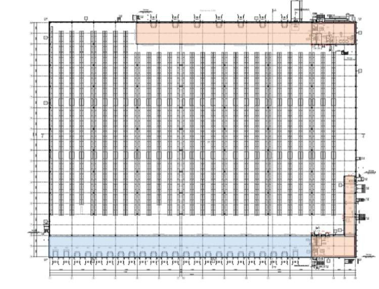 Общая площадь здания- 28 211,5 кв.м. Площадь склада по полу- 21 461,5 кв.м. Площадь складов на мезонинах- 1 809,79 кв.м. Площадь административных помещений (совокупная поэтажная площадь)- 4 214 кв.м. Площадь технических, бытовых и санитарных помещений - 726,21 кв.м.