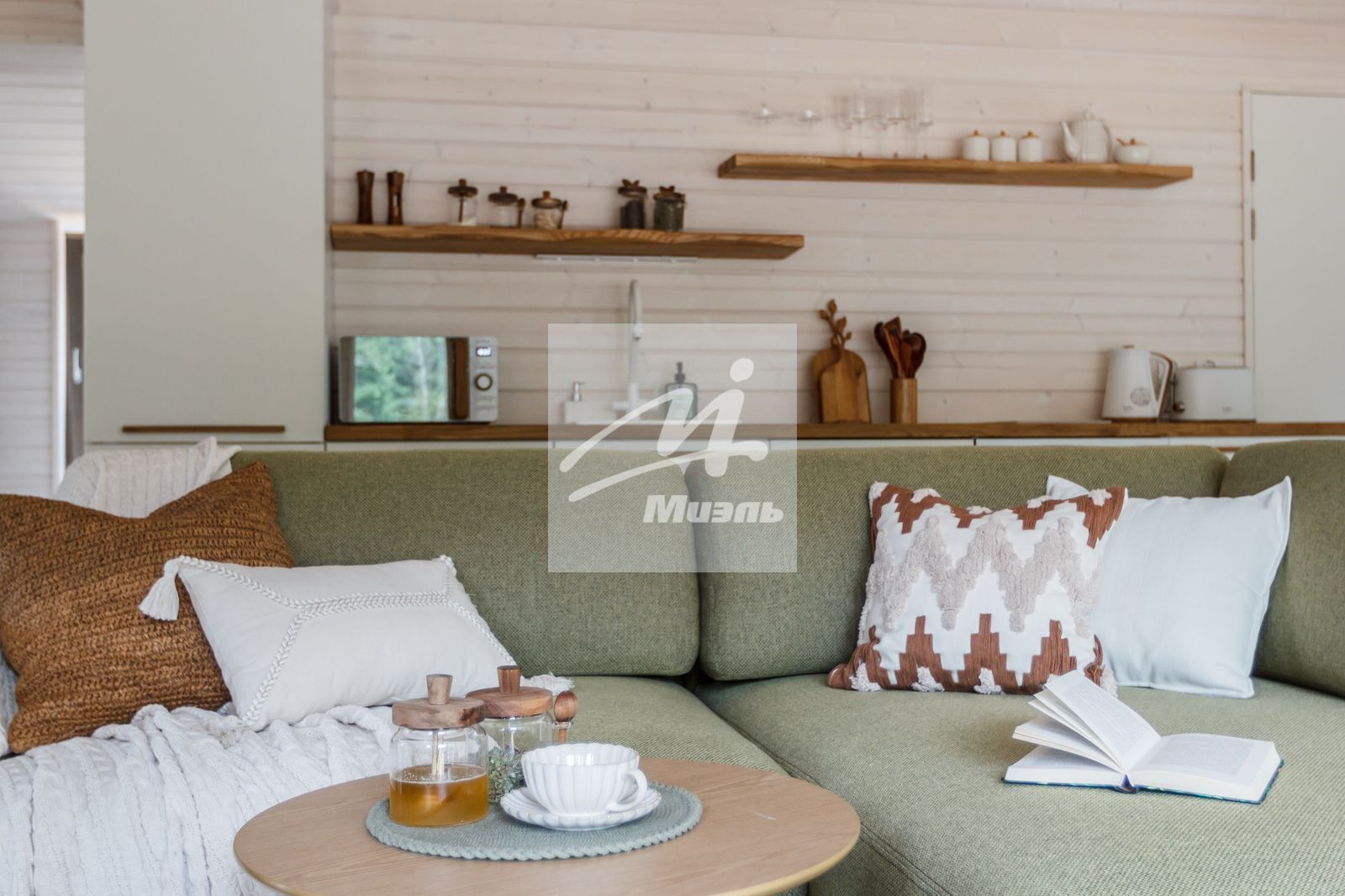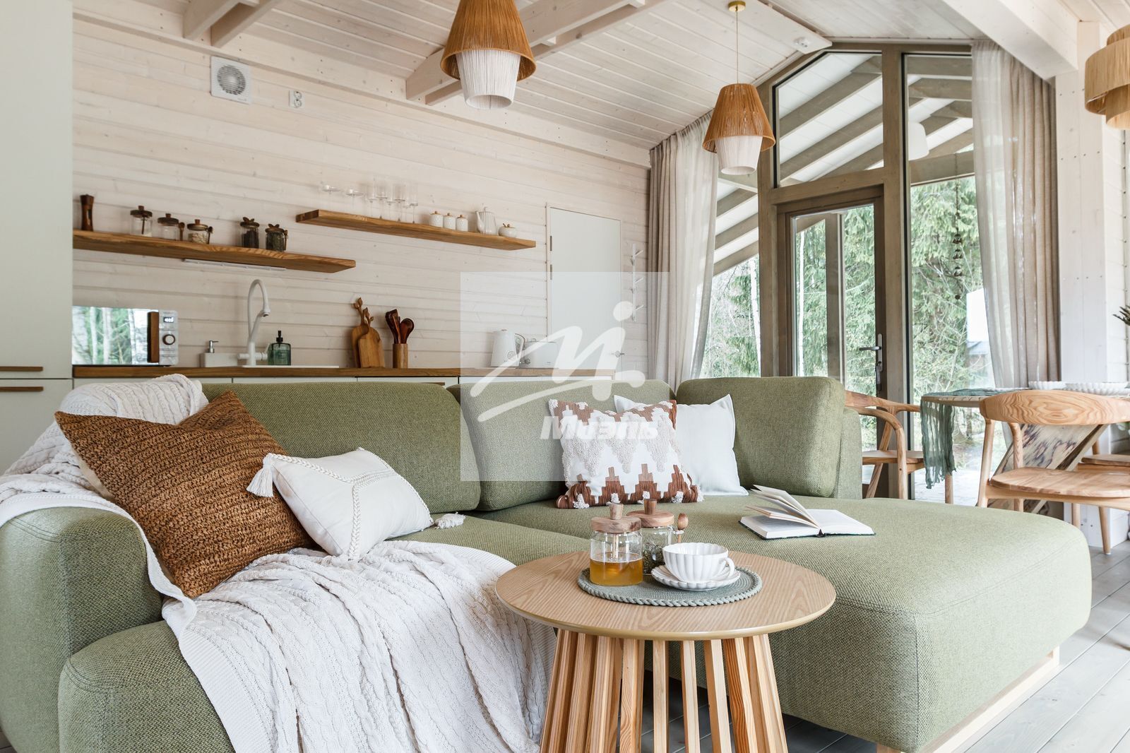 -просторная кухня - гостиная с панорамным остеклением, мягкой мебелью, камином, встроенной бытовой техникой и обеденной зоной – для семейной трапезы и приема гостей
