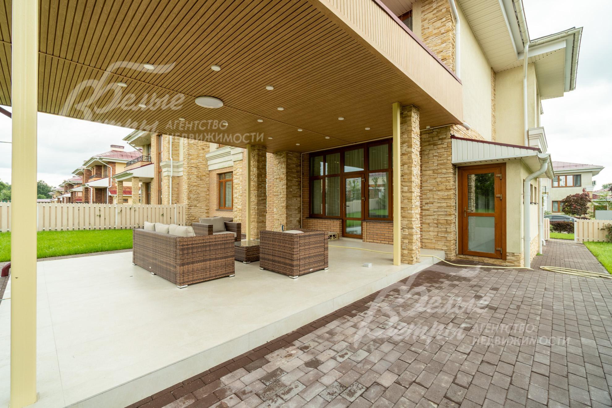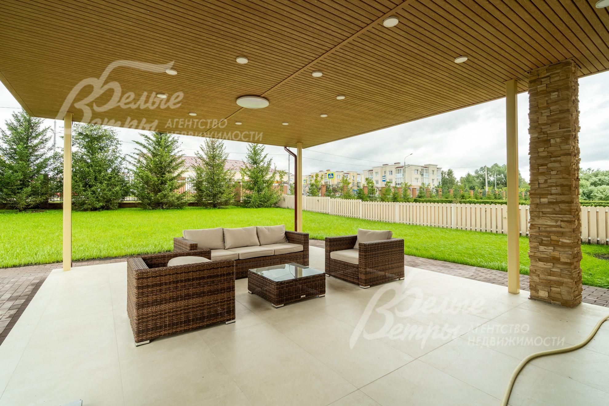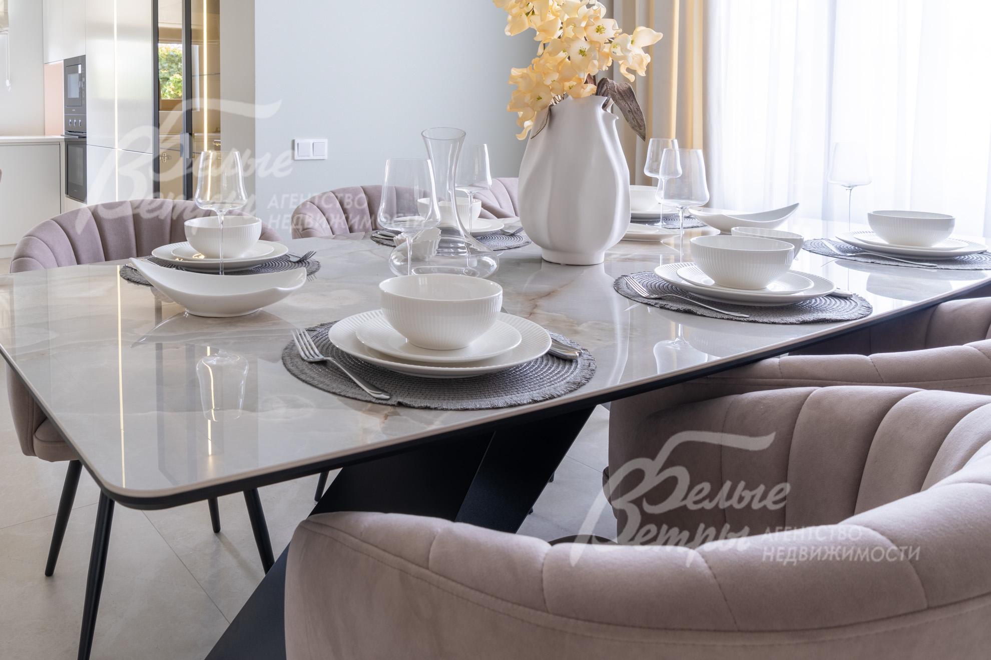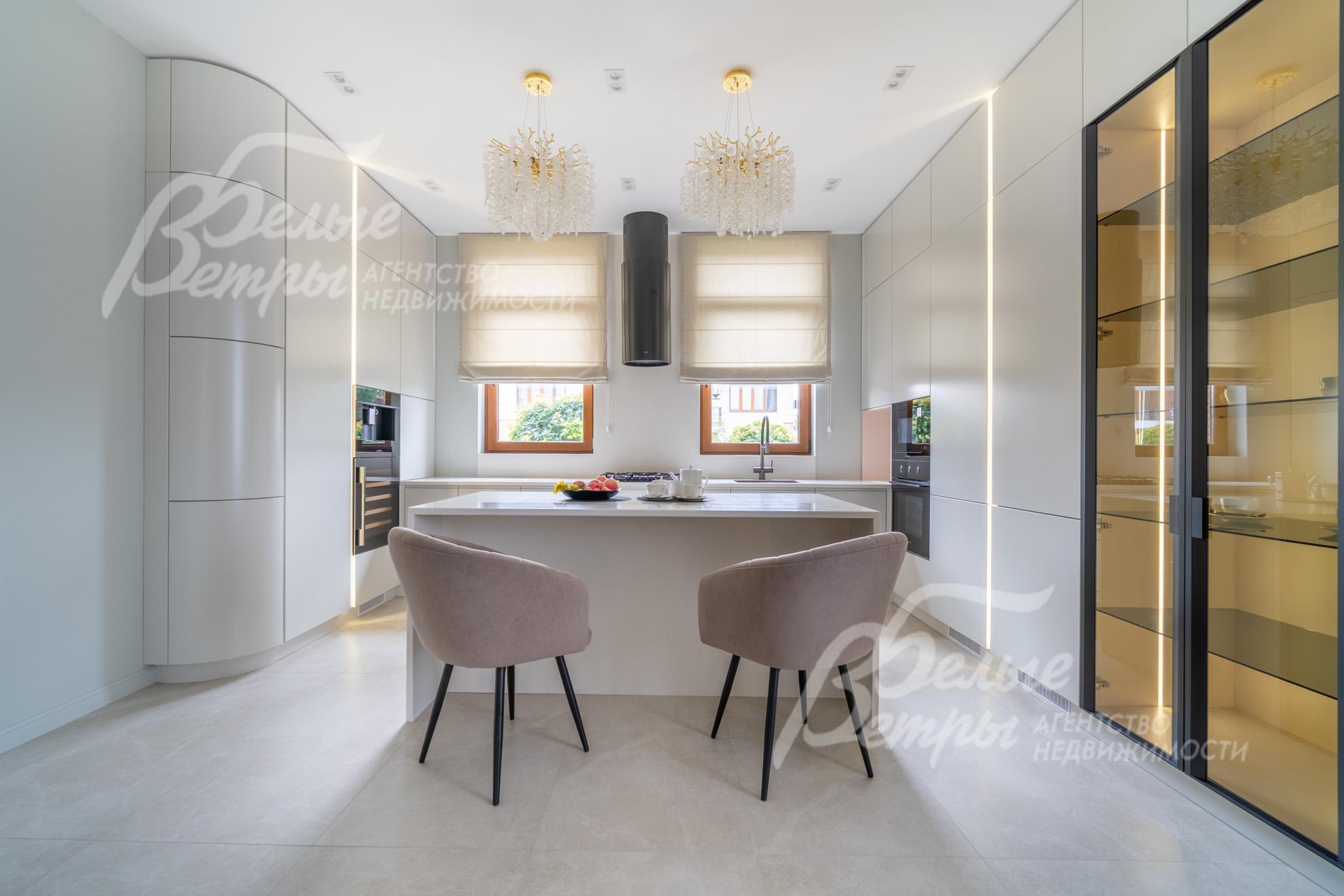 Мебель, оборудование: Установлен кухонный гарнитур с кухонным островом, фасады - МДФ, со всей встроенной бытовой техникой: посудомоечная машина, духовой шкаф с функцией микроволновой печи, кофеварка, вытяжка - все ТМ Maunfeld; холодильник и варочная панель - ТМ Haier. Столовая группа на 8 персон, мягкая диванная группа. Оформлена зона TV. Большой гардеробный шкаф в зоне холла. Особое внимание уделено текстильному оформлению (шелк, бархат, натуральные ткани). Шторы на окнах и рулонные жалюзи позволяют регулировать поток освещения. В Спа зоне оборудована сауна под ключ, установлена деревянная бочка. На веранде комплект мягкой уличной мебели и стол..