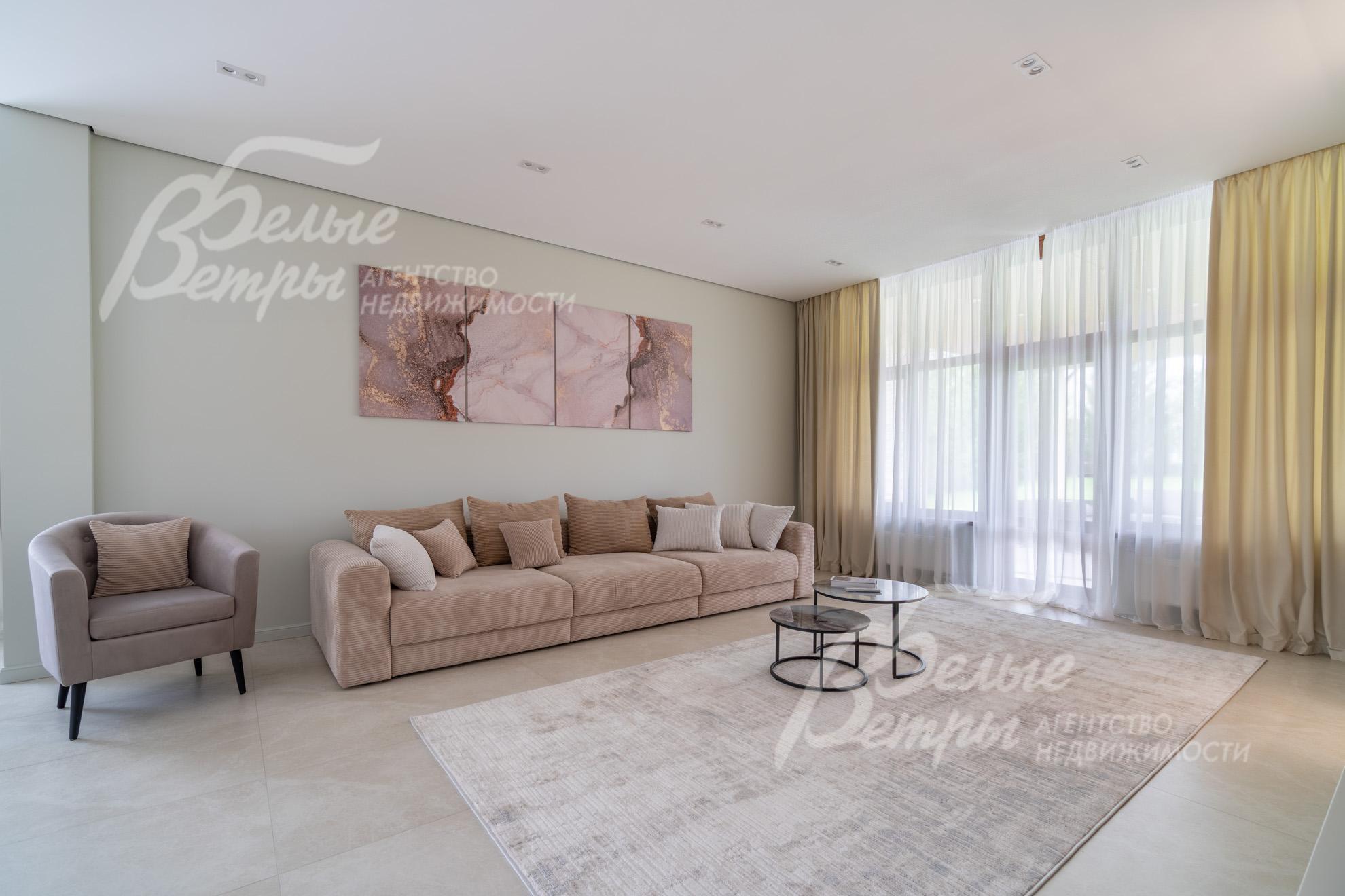 Внутренняя отделка: Современная отделка в спокойных светлых тонах. Стены оштукатурены и окрашены. Пол - крупноформатная плитка KERAMA MARAZZI 40*60см, ламинат 34 класса. Лестница: монолит ж/б, отделана искусственным камнем, с подсветкой. Натяжные потолки с современным освещением. Входная группа, терраса и балконы облицованы керамической плиткой, ограждения кованные металлические..