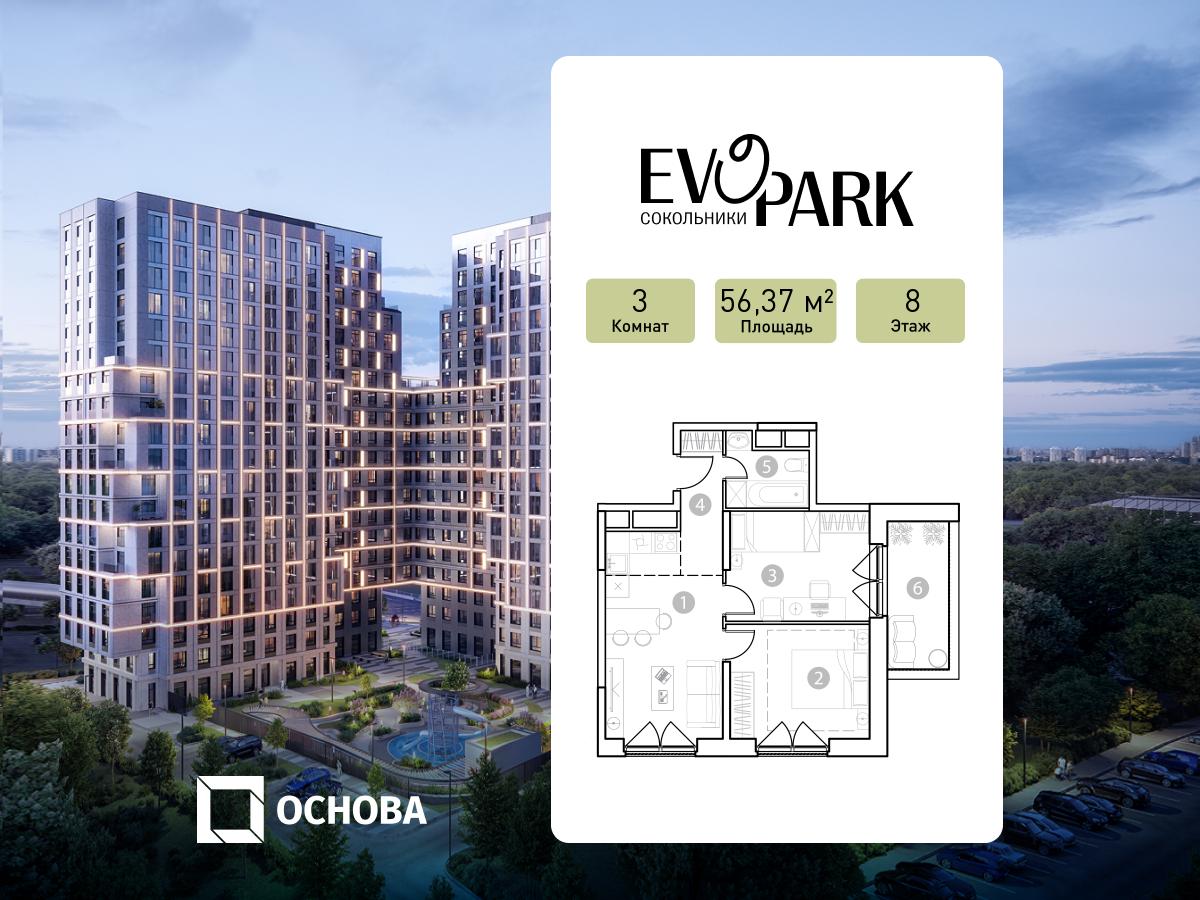 Продаются 3-к апартаменты площадью 56.37 кв.м. на 8-м этаже 20 этажного дома в EVOPARK Сокольники от ГК ОСНОВА.