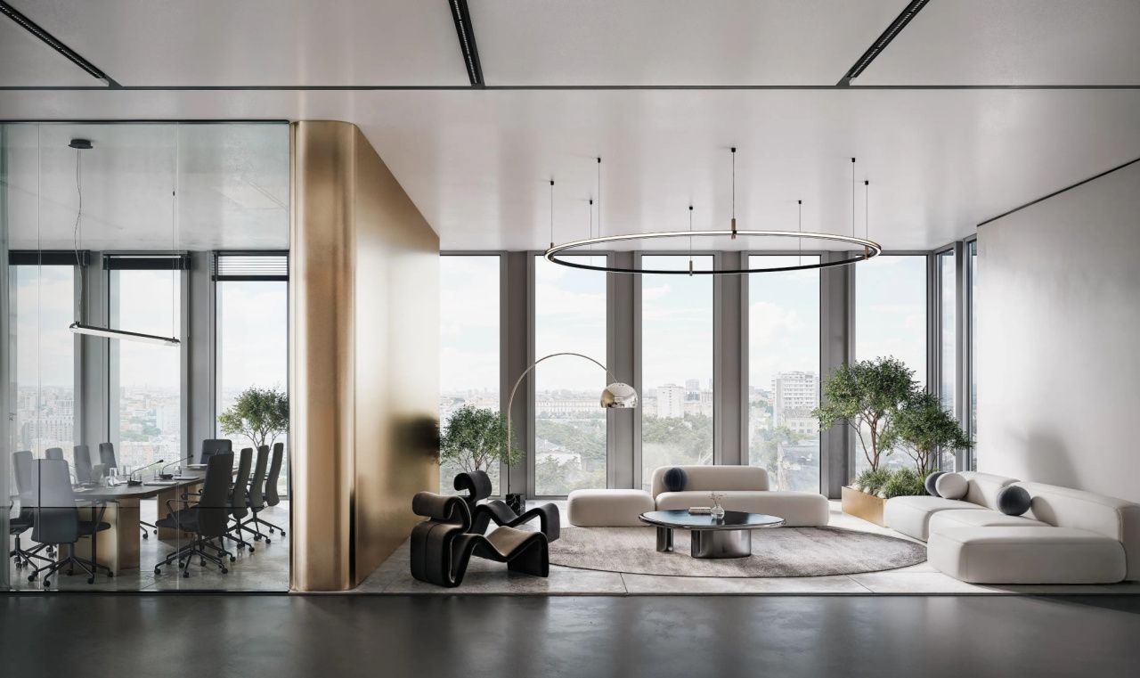 Каждый этаж вместимостью до 173 рабочих места. Дополнительные зоны - ресепшн, переговорные комнаты, кухня, зоны отдыха, гардеробная, принт-зона.