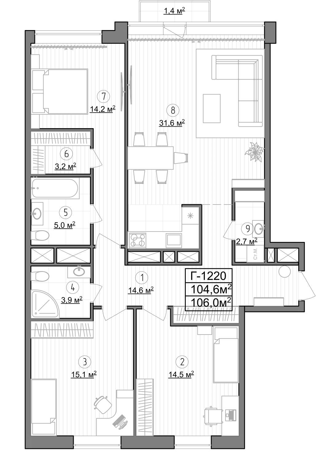 - Kуxня-гocтинaя 31,3 м2