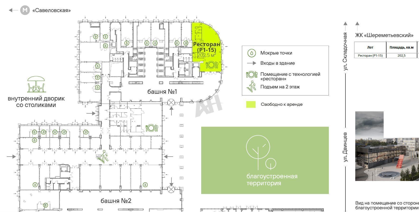 Лот №918087 Предлагаю в покупку последнее оставшееся помещение свободного назначения под общепит (ресторан, кафе), расположенное рядом с центральным входом, на 1 этаже общей площадью 202.5 м2, в 8 минутах пешком от м Савёловская.