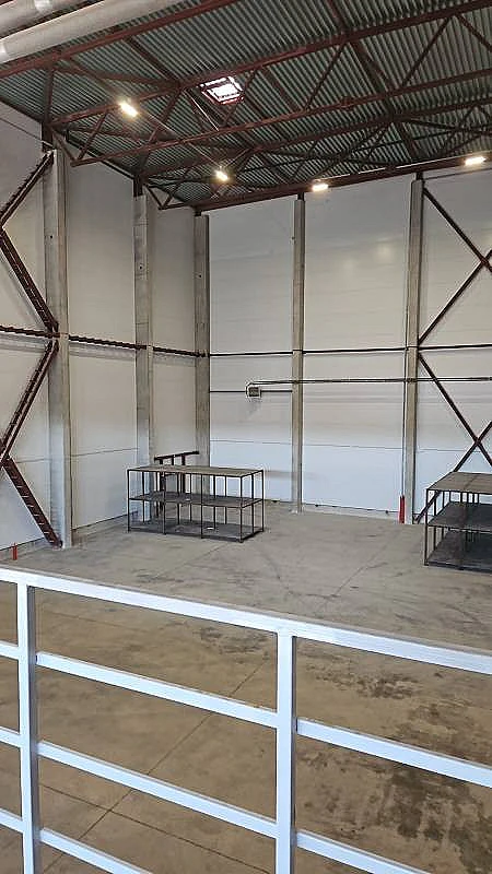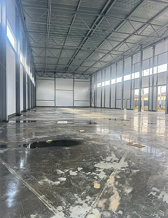 Высота потолков 9 м, в коньке 13,8 м, полы бетон антипыль, 2 ворот в ноль!