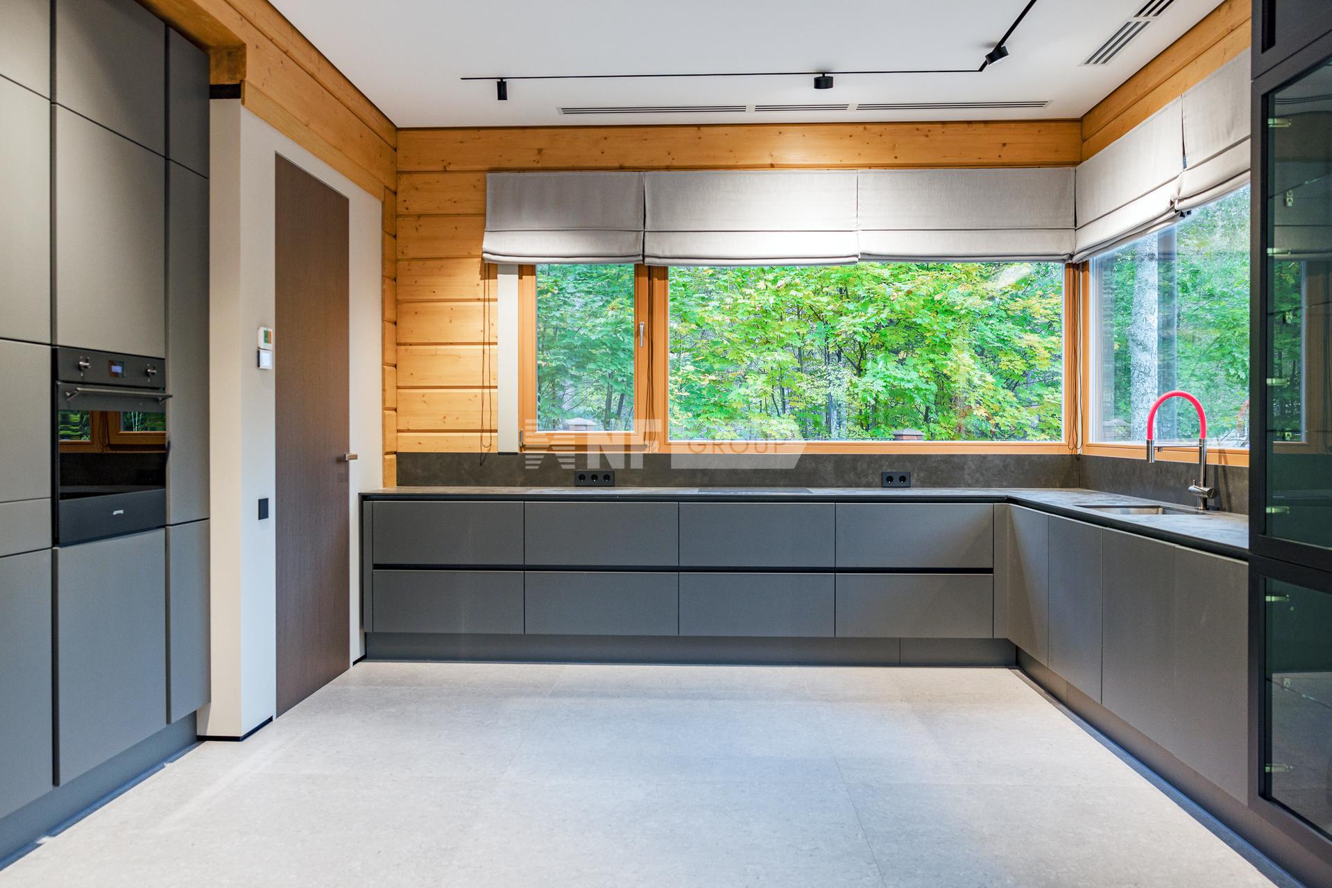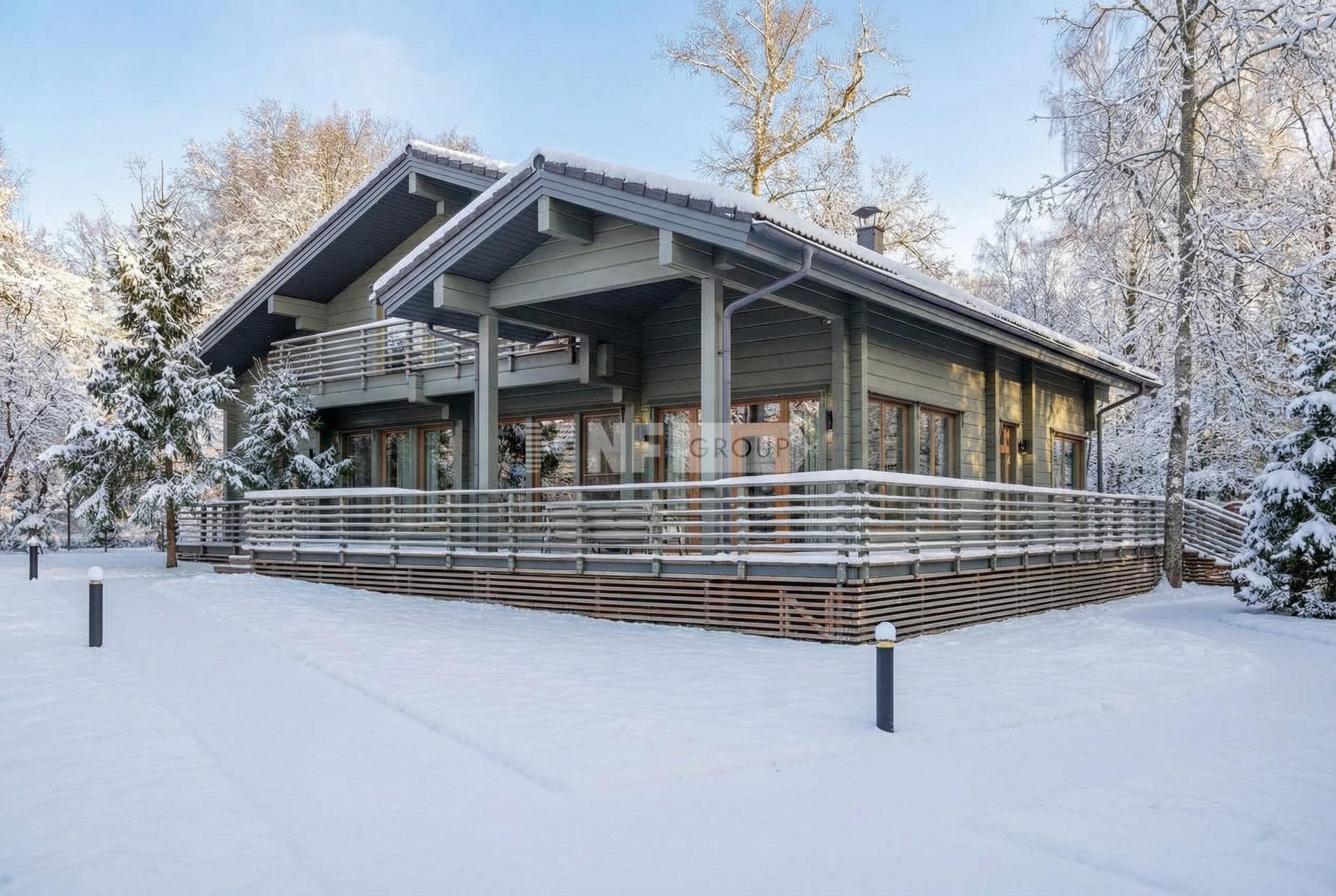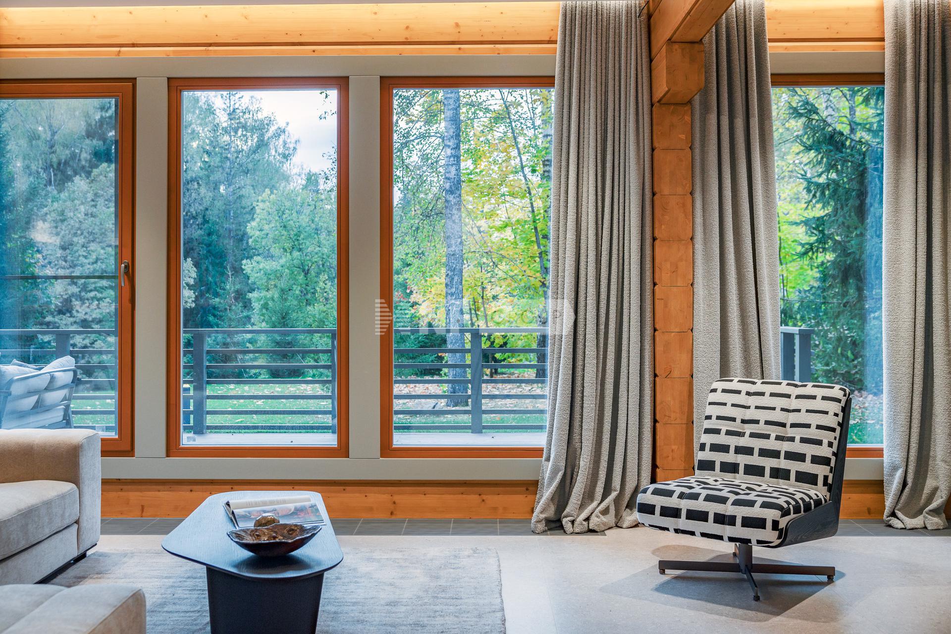Полностью готов к проживанию. Из панорамных окон открывается великолепный вид на собственный сосновый лес.