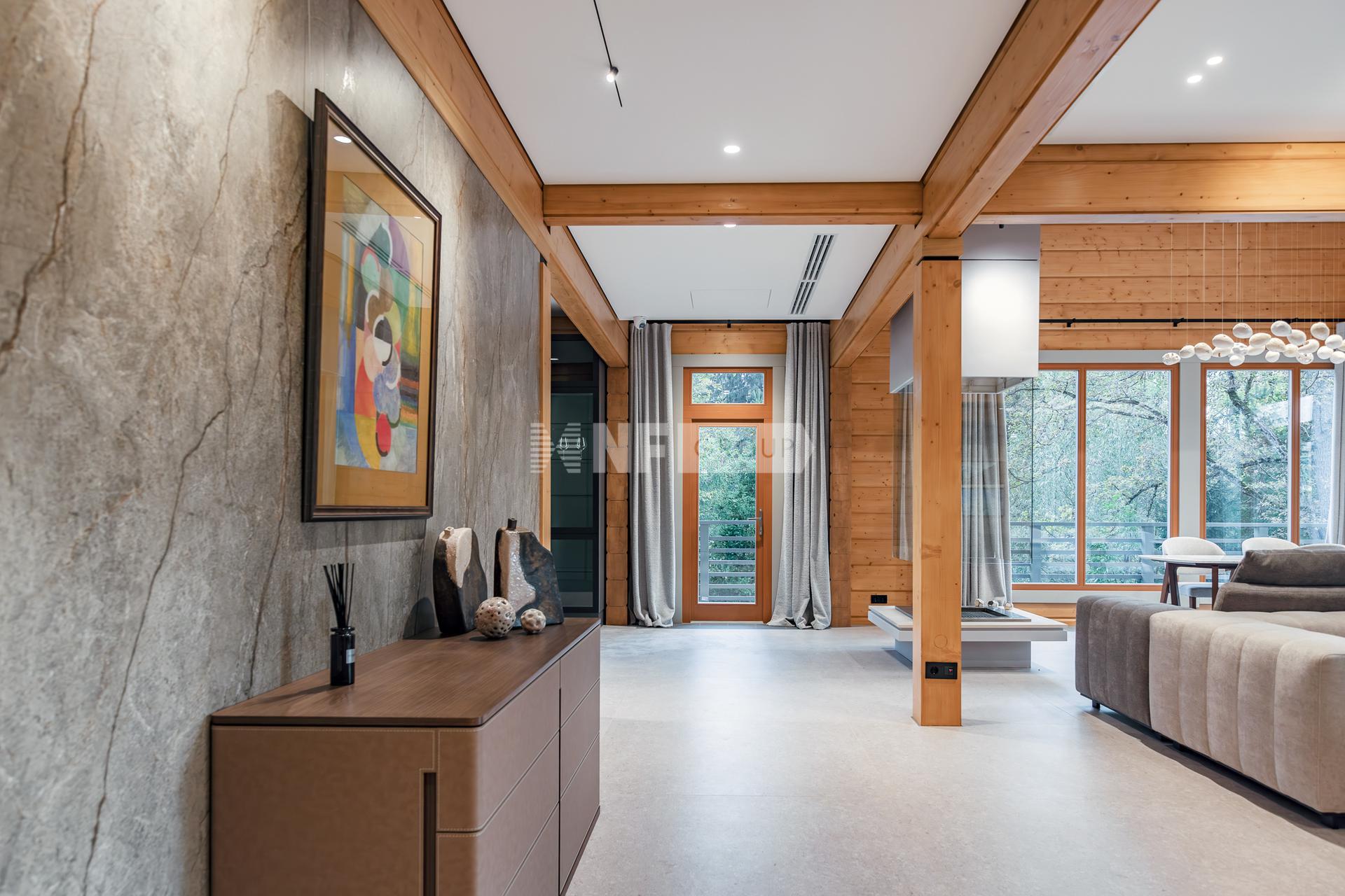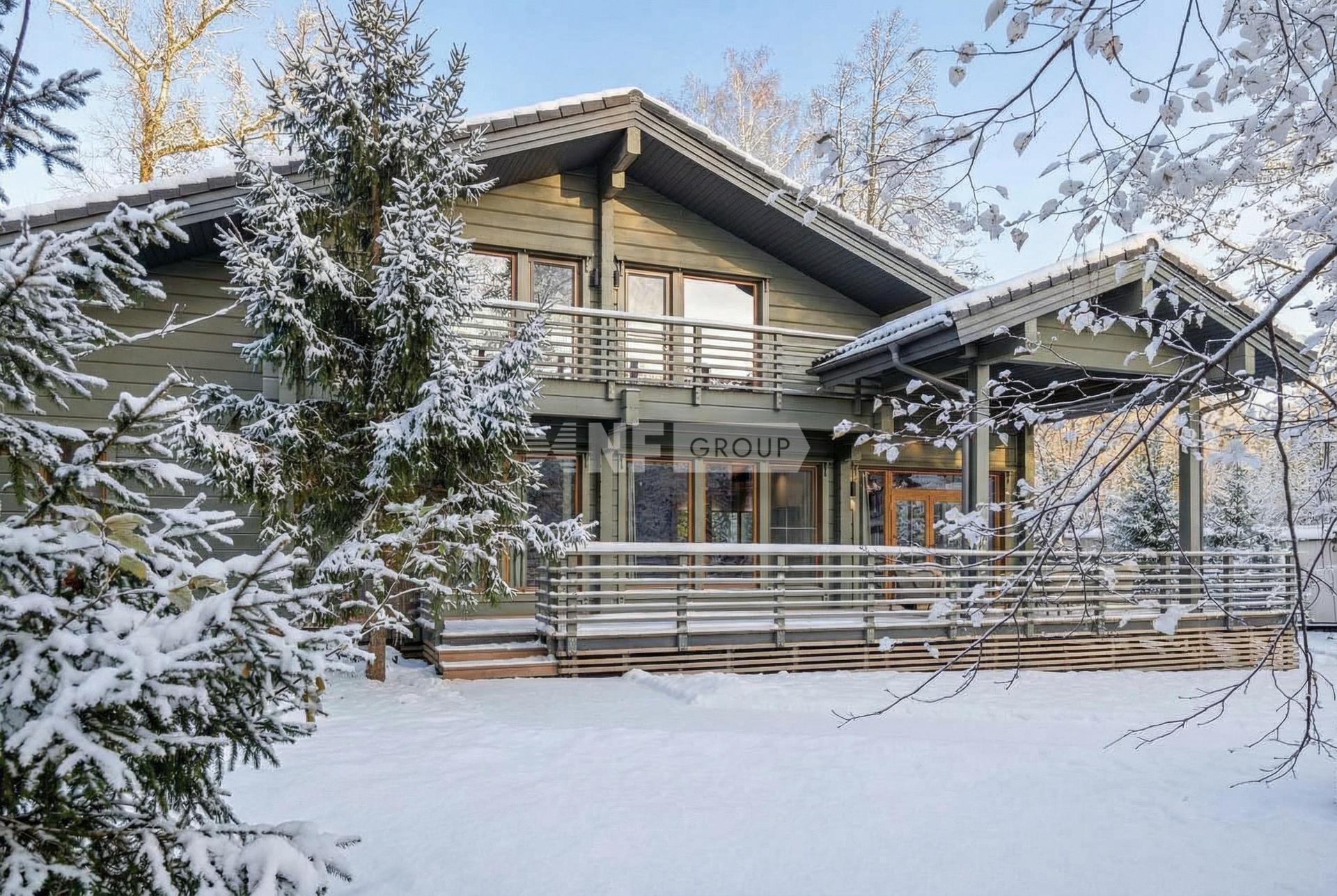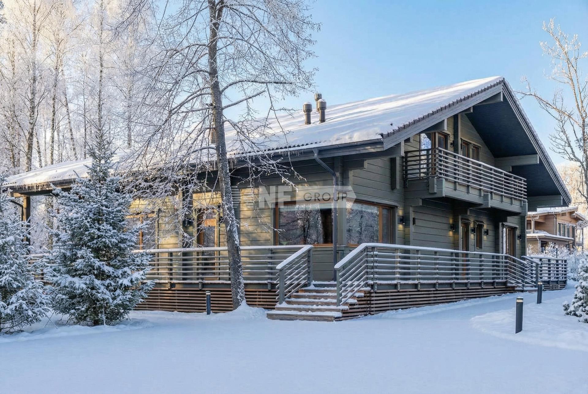 Полностью готов к проживанию. Из панорамных окон открывается великолепный вид на собственный сосновый лес.