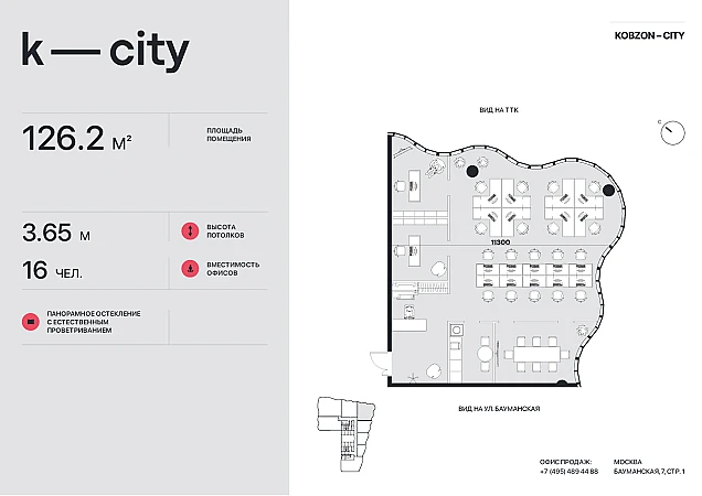 В единственном проекте класса А на Бауманской K-CITY от Застройщика OCTOBER GROUP представлена широкая линейка офисов в продажу от 36 до 716 м2 с возможностью объединения. Офис 126 м2 - привлекательный вариант благодаря панорамному двухстороннему остеклению и потолками 3,65 м. Подходит для размещения на 15-17 человек. Уникальная особенность - волнообразный фасад от архитектурного бюро ТОП-2 в мире.