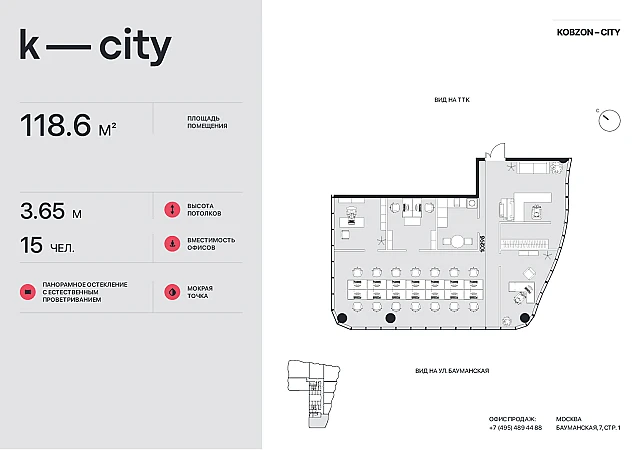 Самый светлый и просторный офис 118 м2 в БЦ K-CITY благодаря панорамному остеклению с 3 сторон и потолками 3,65 метра! Комфортное размещение на 10-15 человек. В единственном БЦ класса на Бауманской от Застройщика.