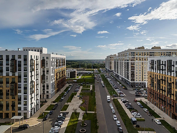 В квартале — монолитные дома комфортной высоты, от 10 этажей. Светлые фасады украшают кирпичные вставки в теплых природных оттенках.