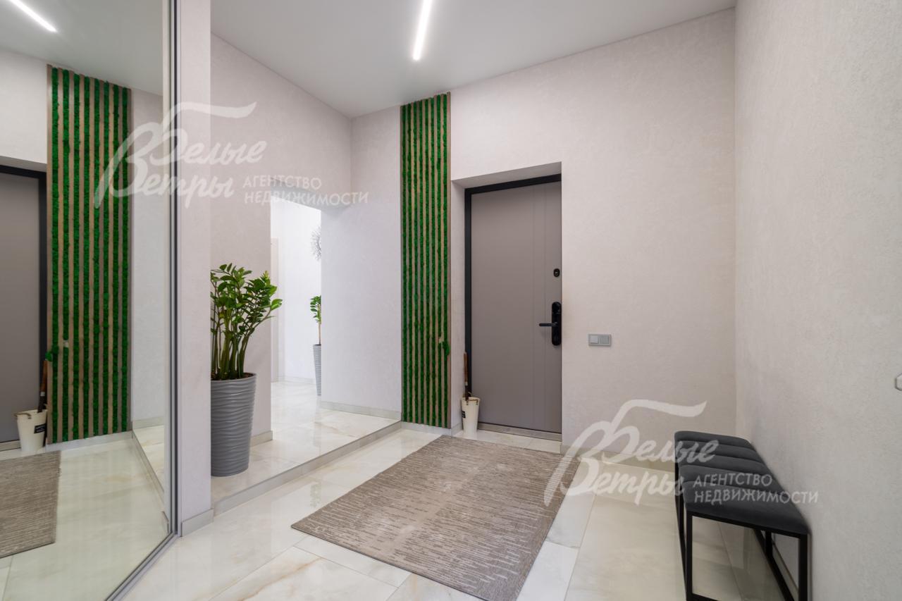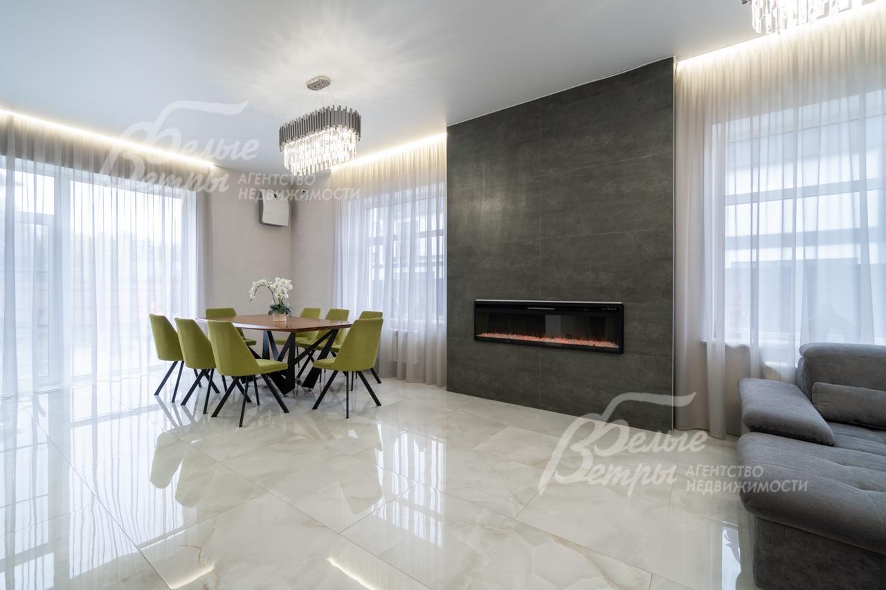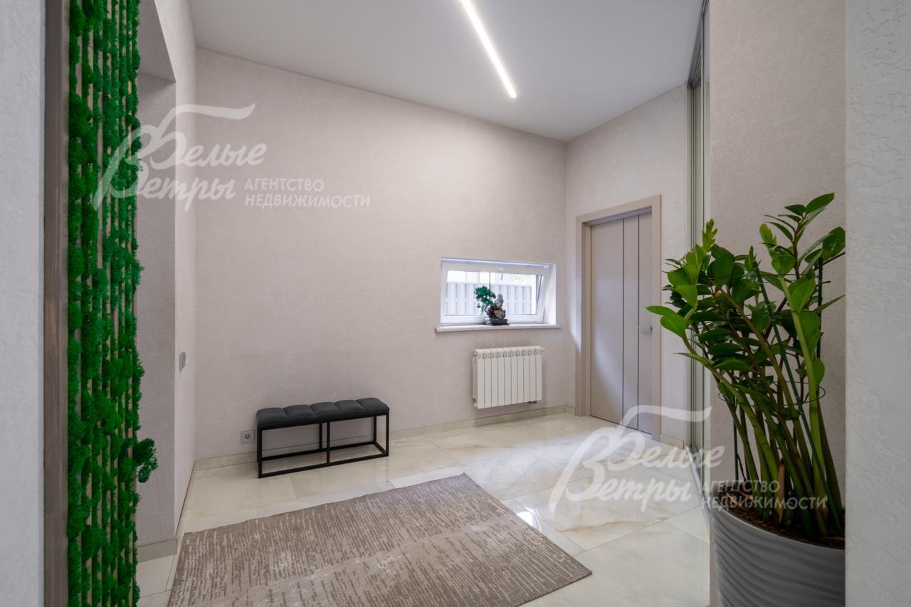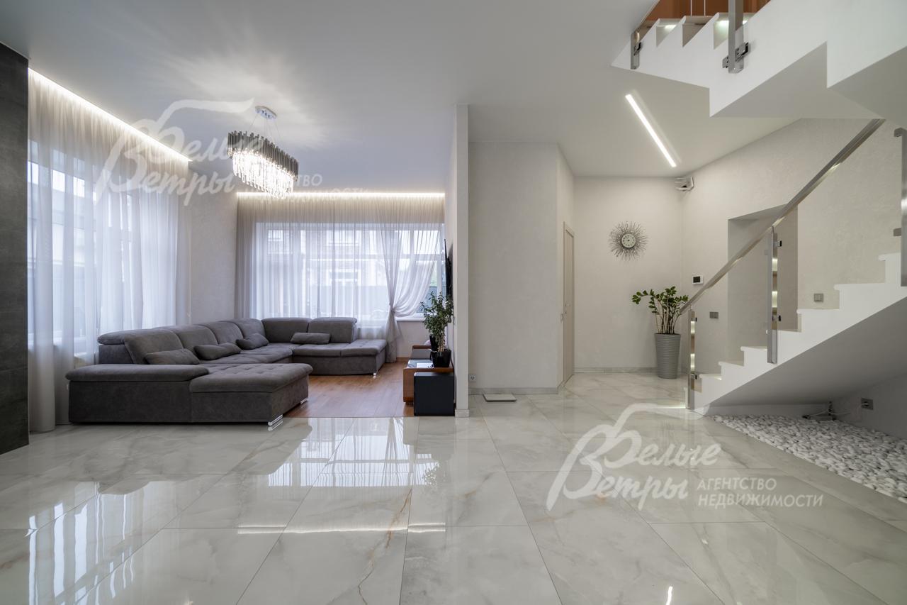 Внутренняя отделка: выполнена современная стильная отделка с использованием премиальных материалов из Италии и Испании. На стенах - декоративная штукатурка, в спальнях - обои, при входе в дом декоративная стена из стабилизированного мха. На полу на 1 этаже итальянская и испанская плитки, на 2 этаже - премиальный ламинат. Железобетонная монолитная лестница, шириной 120 см, цельные ступени из керамогранита, с подсветкой, ограждение - нержавеющая сталь и стекло. Натяжные потолки со встроенным освещением и отдельными эффектными люстрами. Установлена премиальная сантехника марок Catalano, VilleroyBoch, Excellent, смесители Paini, Hansgrohe. Теплые полы по всему 1 этажу, на 2 этаже - в санузлах и на балконе в мастер-спальне. Входная дверь металлическая с терморазрывом, высотой 2.3м, с входом по коду и отпечатку пальца, с возможностью удаленного управления. Межкомнатные двери София. Декоративный электрический камин шириной 1.5 м, с возможностью обогрева и без, с подсветкой разных цветов, встроен в огромный портал шириной 2.5 м и высотой до потолка, отделанный керамогранитом..