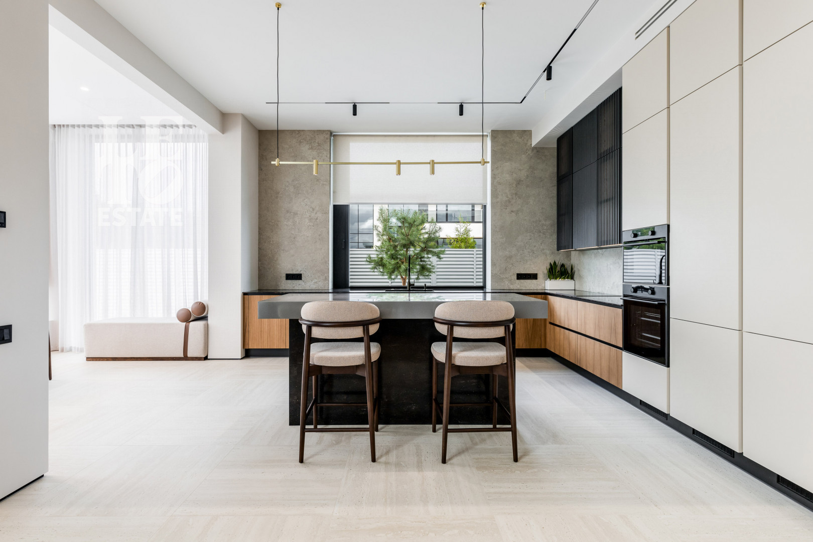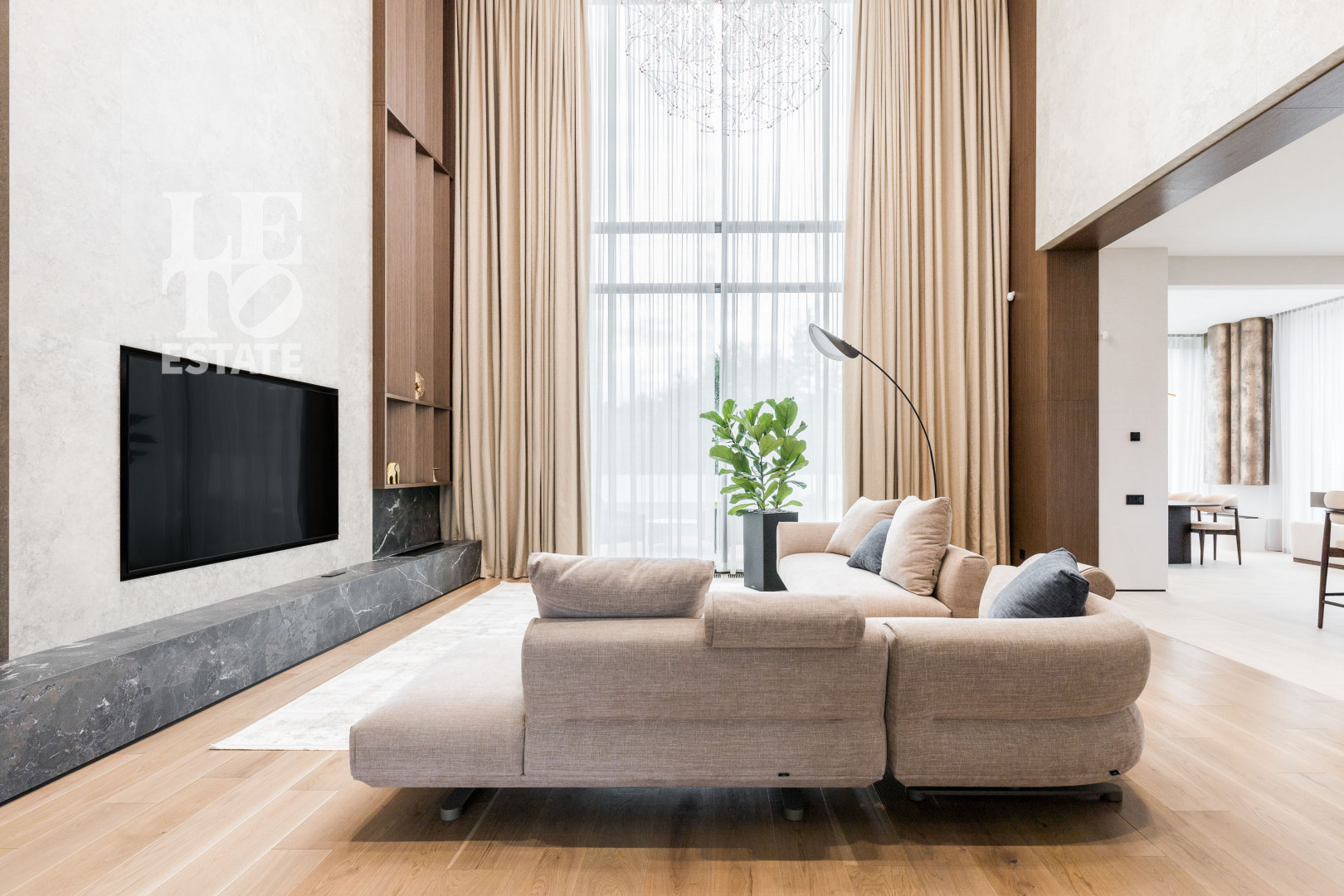 Современный интерьер выполнен в светлых тонах и создает атмосферу уюта и спокойствия. Отделка выполнена из премиальных материалов: итальянская плитка ITALON LAMINAM, Imola Infinity Brazil, Ariostea Marm, Mirage Ginger и др. На стенах использована декоративная штукатурка; напольное покрытие — паркет из дубовой доски; текстиль — из Италии.