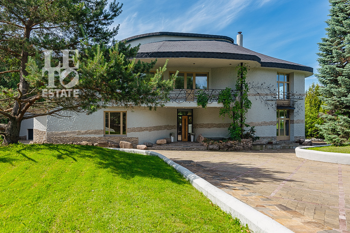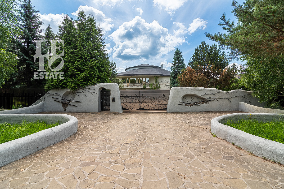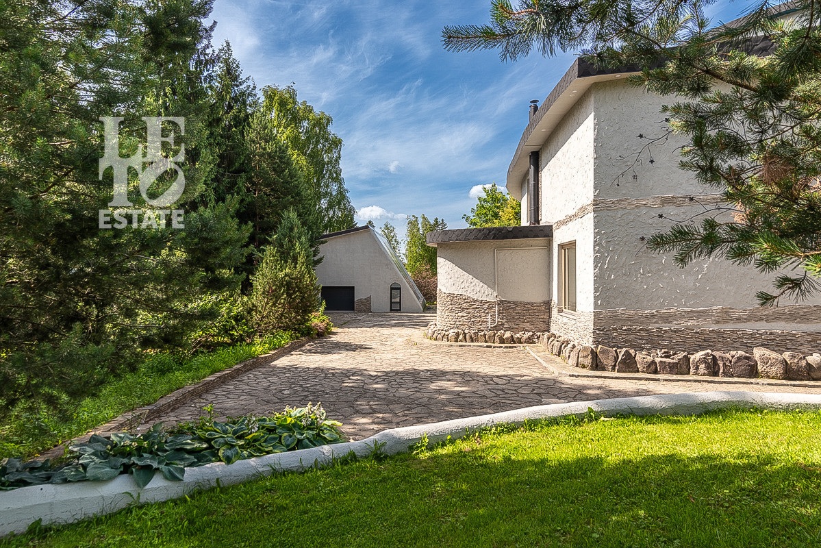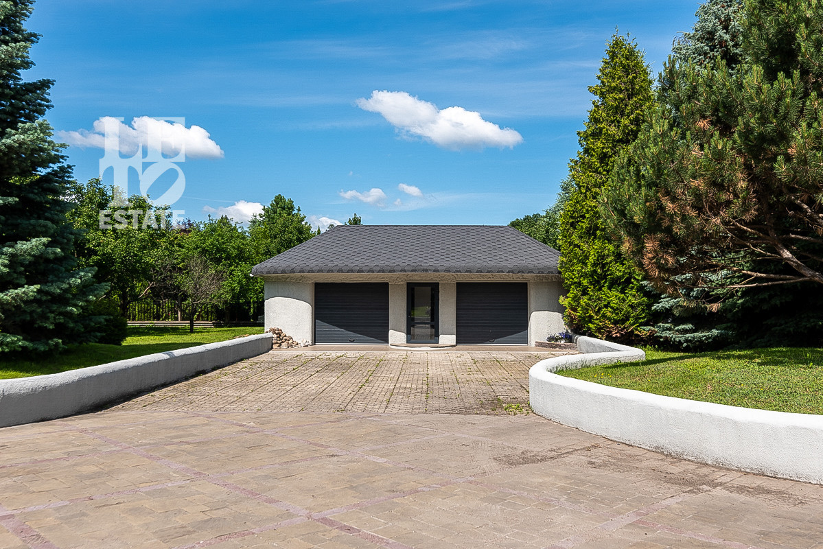 На участке правильной прямоугольной формы, площадью 60 соток, сделаны ландшафтный дизайн, дренаж и ливневстоки. На территории также расположены оранжерея с квартирой для персонала (площадь 150 кв м), гараж (98 кв м) для 2-х автомобилей, большая беседка и вольер для собак.