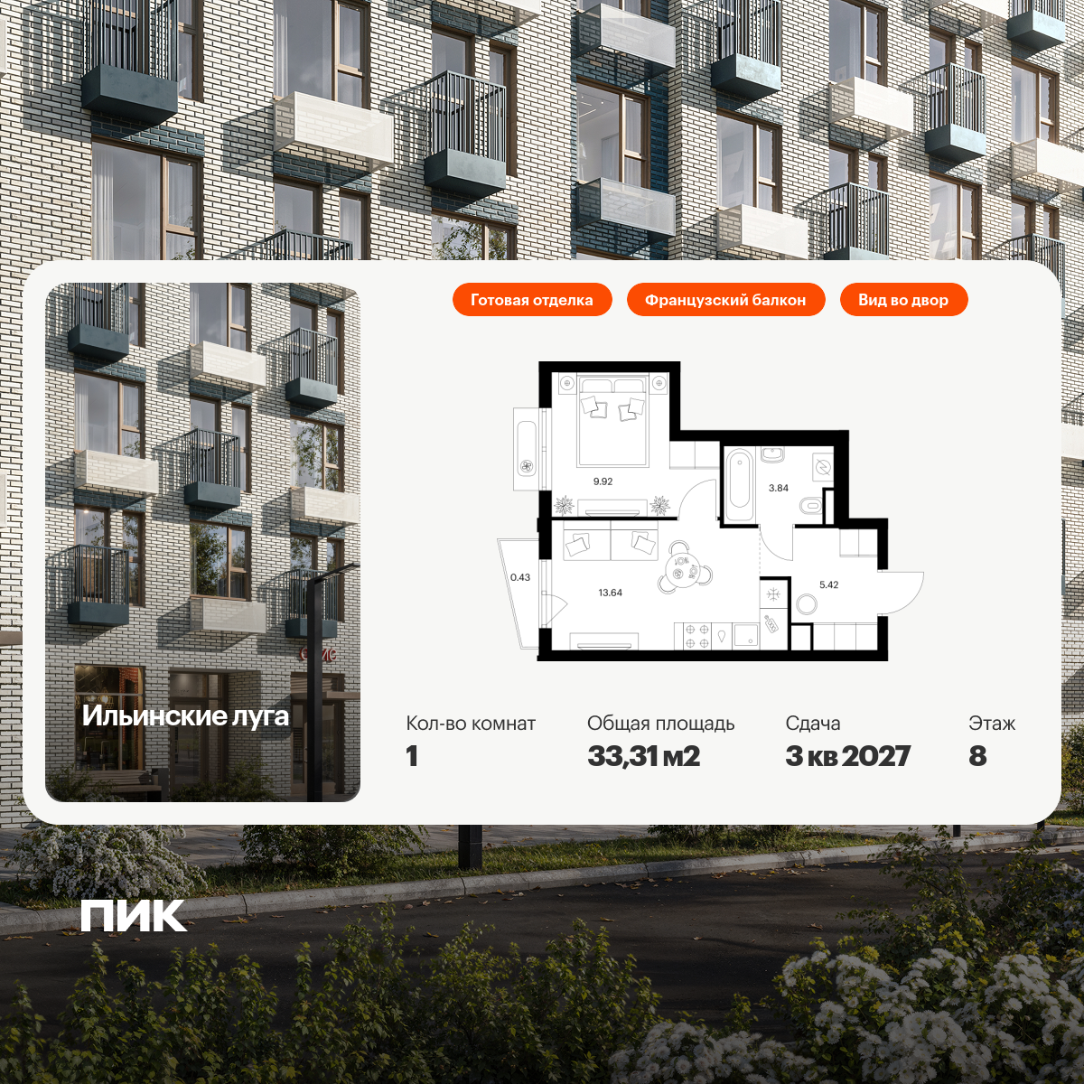 Продаётся 1-комн.квартира площадью 33.31 кв.м на 8 этаже 9 этажного дома (Корпус 4.2, секция 2) проекта ПИК Ильинские луга. Светлый просторный подъезд на уровне земли, функциональная планировка, большие окна, с отделкой.