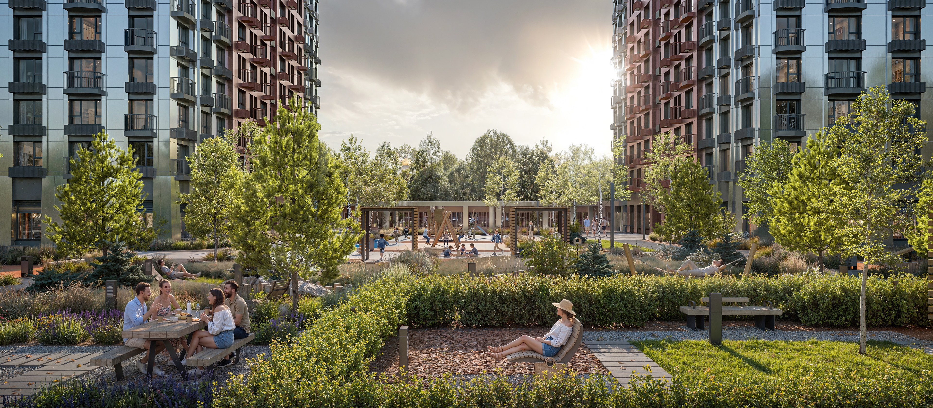 Во дворах — зелёные парки с местами отдыха, детскими и спортивными площадками. На первых этажах домов работают магазины, кафе и полезные сервисы. А для владельцев автомобилей предусмотрены многоуровневый и подземный паркинги.
