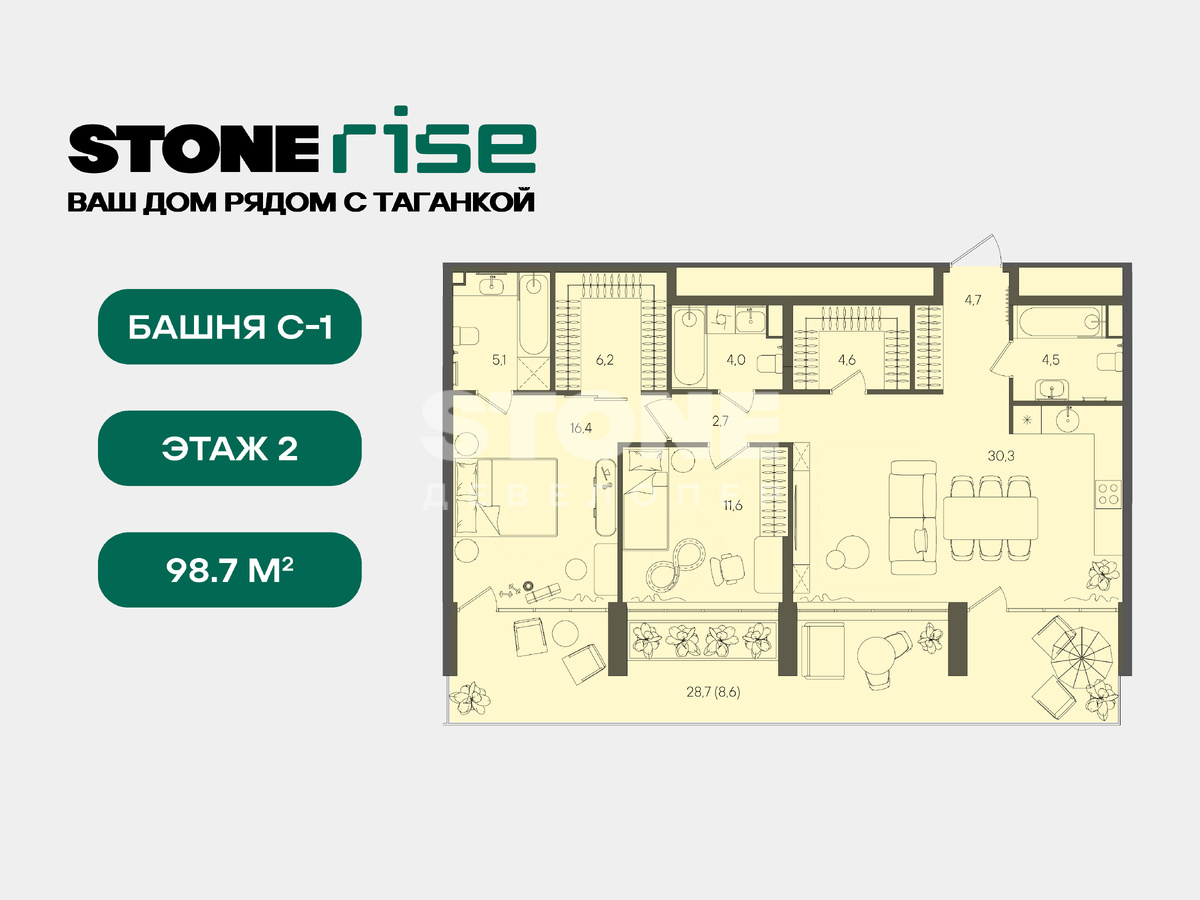 Купить 2к квартиру 98 м² в ЖК STONE Rise