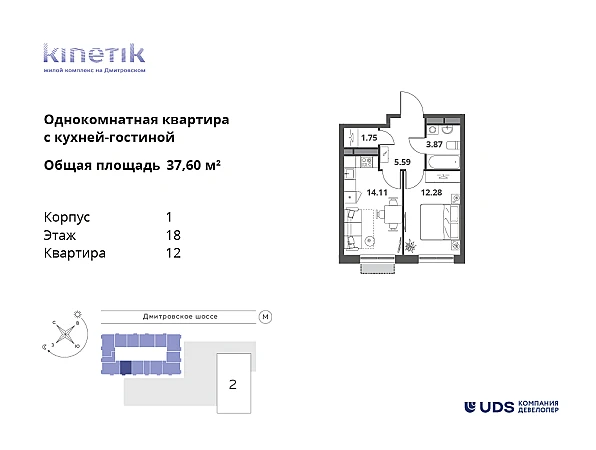 Купить 2к квартиру 37 м² в ЖК Kinetik (Кинетик)