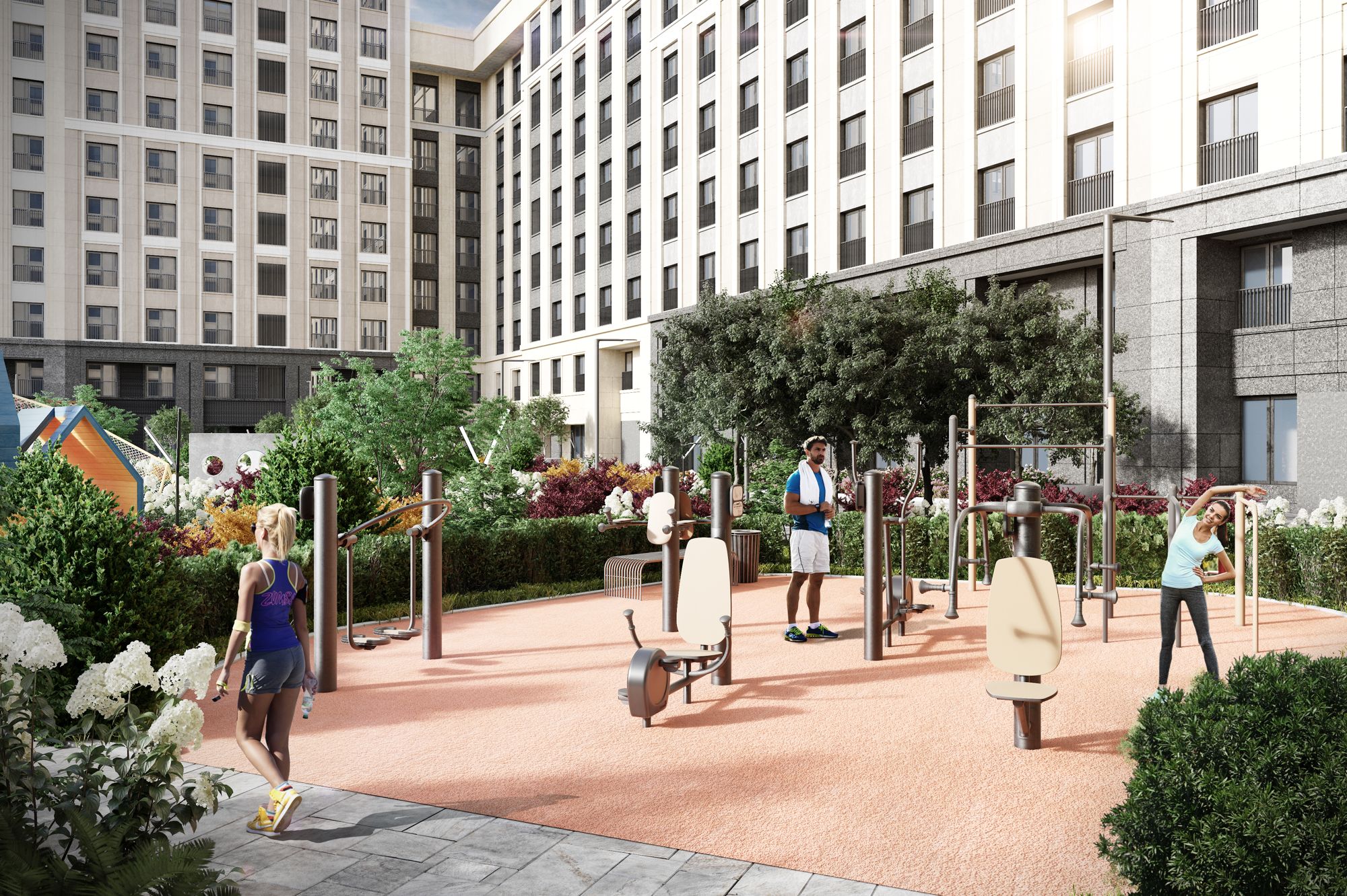 Свой приватный двор-сквер площадью 3 600 м2 с пространствами для всех возрастов: на территории располагаются игровые площадки, детский городок, песочница, воркаут-зоны, батуты, места для отдыха, лабиринты, настольный теннис и шахматные столы.