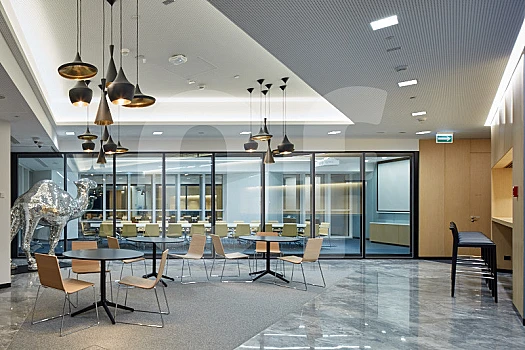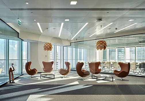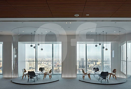 Общие зоны на этаже - ресепшн, переговорные комнаты, оборудованная кухня и зона приема пищи, гардеробная, мягкая зона отдыха.