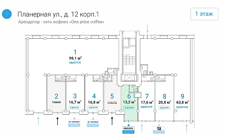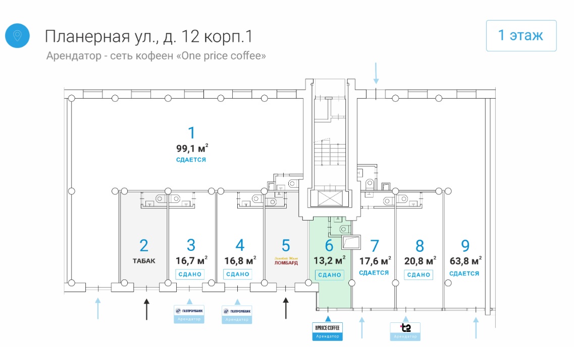 Номер лота на нашем сайте: 44596. Предлагается к приобретению готовый арендный бизнес общей площадью 13.2 м 2 в 120 метрах от выхода из метро и ТПУ "Планерная". Первый дом от метро. Реклама на фасаде. Пассажиропоток станции составляет до 15 000 чел. в час. Арендатор Сеть кофеен One Price Coffee . МАП 260 000 рублей. Коммунальные платежи и электричество оплачиваются арендатором отдельно. Первый этаж жилого дома. Отдельный вход, своя погрузка-разгрузка. Помещение правильной формы, открытая планировка. Высокие потолки 3.7м . Окна-витрины "в пол". 25 кВт (возможно увеличение до 35 кВт).