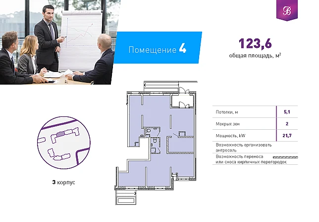 Класс B+. Цокольный этаж. Помещение без ремонта. Есть возможность организовать антресоль, что дополнительно увеличит полезную площадь помещения на 30-40%. Отдельный подъезд с пандусом. Большие панорамные окна. 2 мокрые зоны.