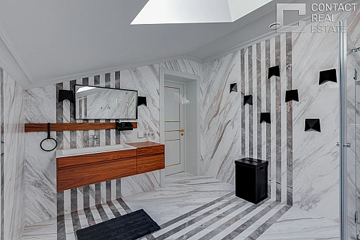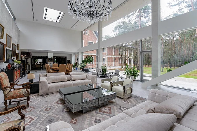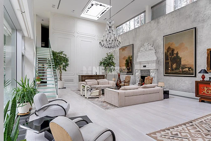 Свежая реконструкция дома сделала проект не только красивым, но и удобным для жизни. В резиденции царит атмосфера богемного Парижа, благодаря известному декоратору Ангелине Аскери: большие окна, белые стены, лепнина, живопись, антикварные вещи, камин. Стены гостиной покрыты гипсовой лепниной «Арт-Бетон» от ARTFN. Камин – точная реплика XVII века. Диваны и столы от Cavalli. В новой части дома высота потолков достигает 7 метров.