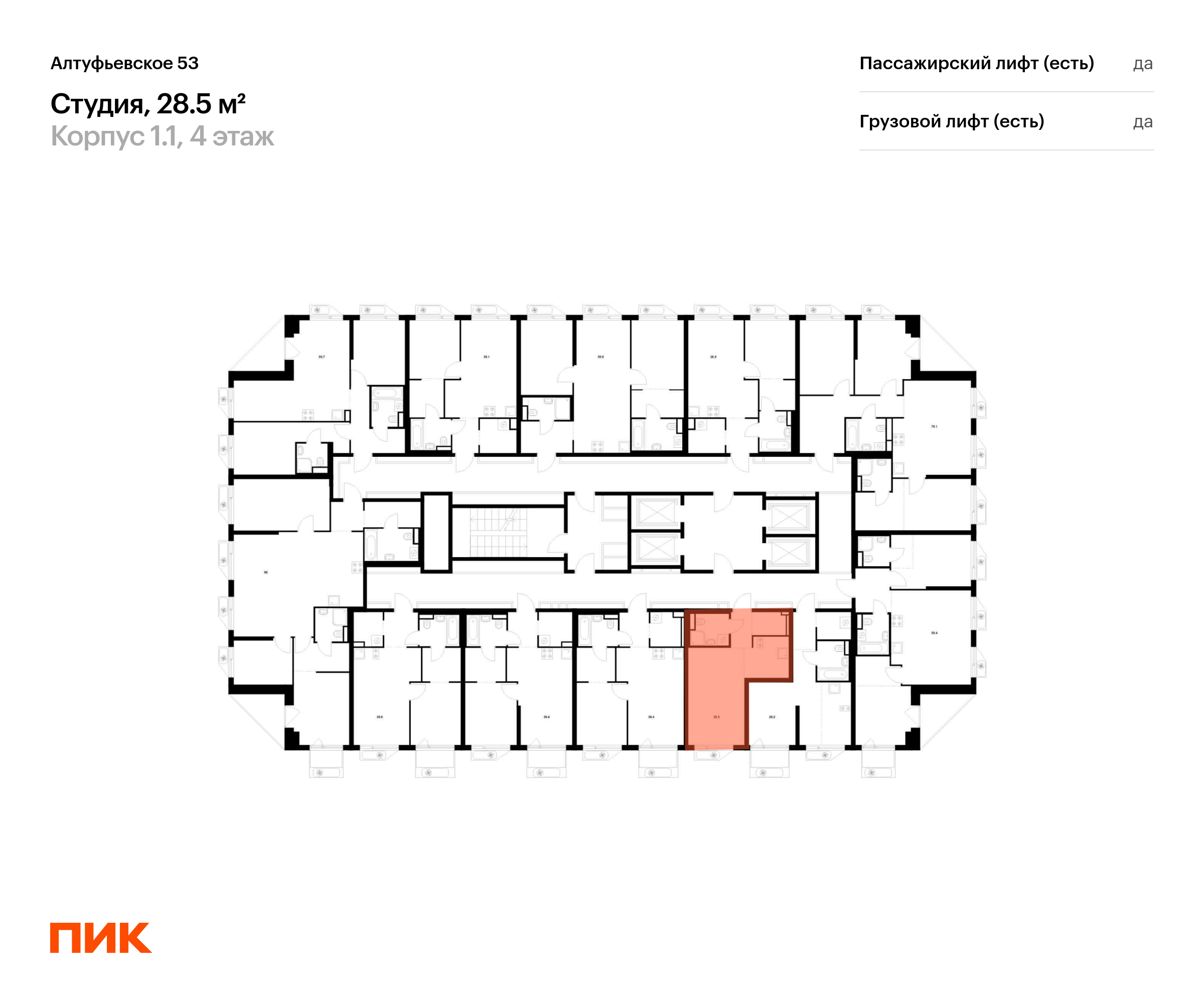 Продаётся квартира-студия площадью 28.50 кв.м на 4 этаже 32 этажного дома (Корпус 1.1, секция 2) проекта ПИК Алтуфьевское 53. Светлый просторный подъезд на уровне земли, функциональная планировка, большие окна, с отделкой.
