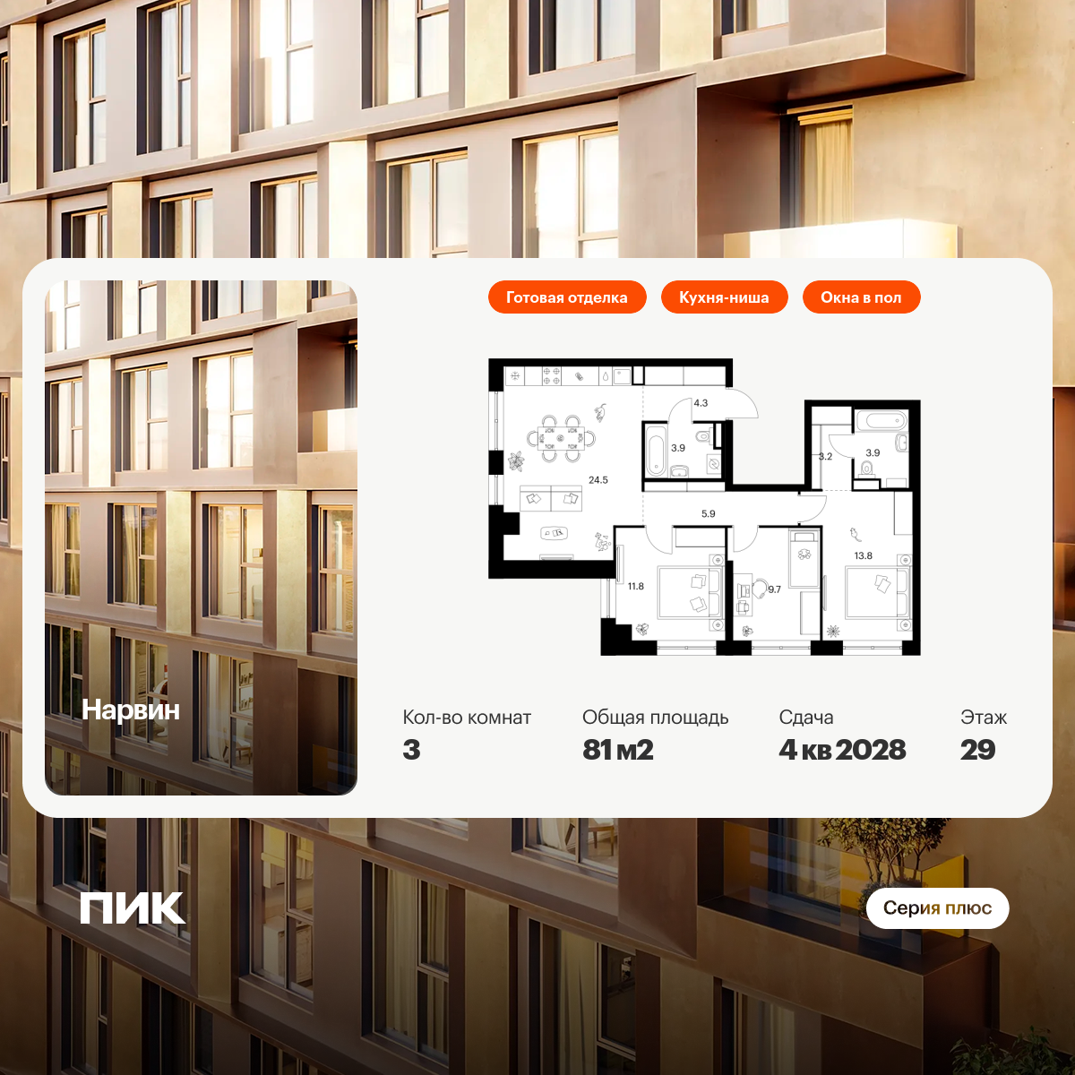 Продаётся 3-комн.квартира площадью 81.00 кв.м на 29 этаже 38 этажного дома (Корпус 1.3, секция 3) проекта ПИК Нарвин. Светлый просторный подъезд на уровне земли, функциональная планировка, большие окна, с отделкой.