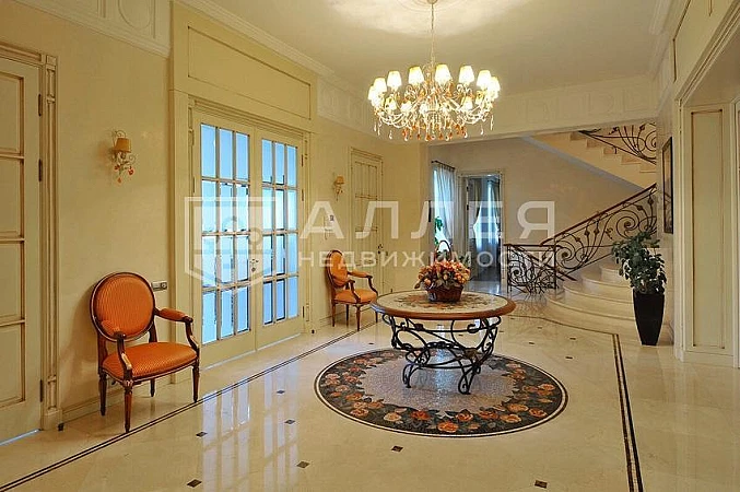 Особняк выполнен с изысканным вкусом стиля. Отделка выполнена из дорогих натуральных материалов и ценных пород дерева. Многие элементы выполнены с использованием ручной работы. Мебель от известных ведущих мировых брендов.