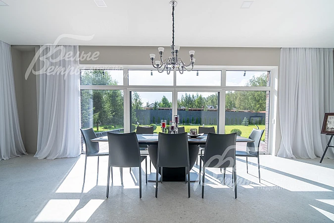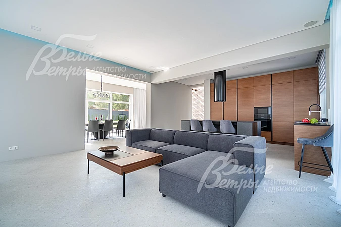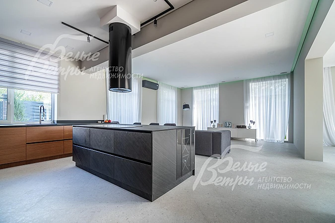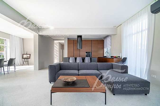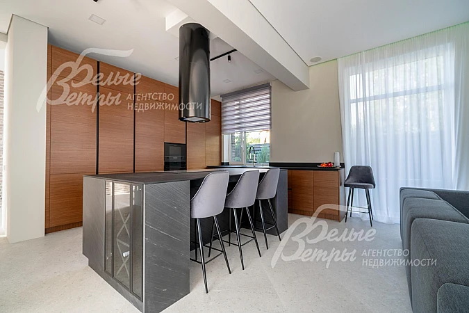 Мебель, оборудование: дом полностью оборудован сантехникой и мебелью в общих помещениях. На кухне – гарнитур с фасадами из шпона ореха, столешница Compact HPL FunderMax, встроенная техника SMEG (двухкамерный холодильник, духовой шкаф, СВЧ, широкая посудомоечная машина, электрическая варочная индукционная поверхность (на острове, 5 конфорок)), измельчитель, потолочная вытяжка (над варочной поверхностью), врезная мойка со смесителем Omoikiri, выдвижные системы хранения – «волшебные» уголки, встроенные выезжающие из столешницы блоки розеток (в трех местах). Кухонный остров 240×120 см – с полубарным столом на 3 персоны и стульями (4 шт.), с фасадами из шпона натурального черного сланца, с 2 витринами с подсветкой. В столовой – раздвижной обеденный стол (BoConcept (Дания) на 8-12 персон с кожаными стульями. В гостиной вся мебель BoConcept (Дания): большой диван, журнальный столик, трансформируемый под кофейный, тумба под телевизор, напольный светильник. В прихожей установлен встроенный шкаф до потолка с зоной для обуви на теплом полу. В гардеробной мастер-спальни - система хранения открытого типа. Во всех комнатах – тюль на скрытом карнизе. Светильники и люстры - от немецких производителей. В квартире персонала: кухонный гарнитур с техникой (холодильник, варочная поверхность, духовка), встроенный шкаф в прихожей и сантехника. Вся сантехника от Jacob Delafon (производство- Франция): унитазы, раковины, душевые смесители с терморегуляторами, гигиенические души, также электрические полотенцесушители, трапы с двойным затвором (сухой и мокрый): фурнитура (профили душевых кабин, кнопки инсталляций, держатели бумаги, полотенцесушители)...