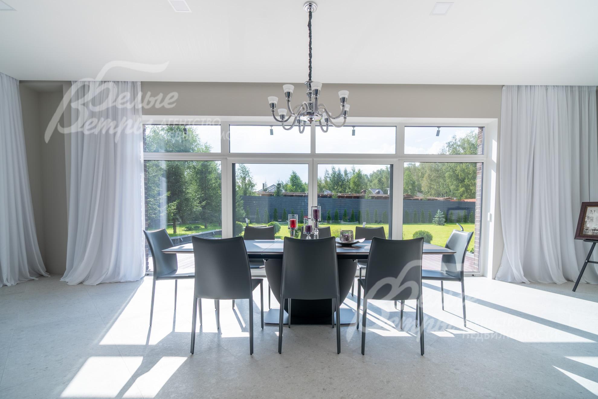 Внутренняя отделка: интерьер дома выполнен по дизайнерскому проекту с элементами стиля лофт с применением дорогостоящих материалов высокого качества. В холлах стены отделаны декоративной плиткой «под фасадный кирпич», органично продолжающей внешнюю отделку дома в интерьере. Стены в других помещениях окрашены в благородный серый оттенок, приятный для глаз. Стены санузлов оформлены в едином стиле: от пола до потолка - бежевый керамогранит высшего сорта (Keramma Marazzi, имитация мрамора, внешние углы запилены под 45°). В мастер-спальне со стороны изголовья – дизайнерские обои. На полу 1-го этажа и в санузлах 2-го этажа – керамогранит (Keramma Marazzi) с водяным подогревом, в остальных помещениях – дубовая инженерная доска. На полу террасы – лиственница экстра-класса (пол террасы - на одном уровне с полом гостиной). Потолки из гипсокартона, в том числе подвесные, с теневым профилем и подсветкой вдоль карниза, со встроенными стильными потолочными светильниками. Установлены стальные панельные радиаторы белого и чёрного цвета (Kermi и Prado), розетки и выключатели Yung (Германия), в том числе мастер-выключатель. Интерьер дополнен межкомнатными дверьми из массива дуба (филёнчатые лакированные белого цвета с итальянской фурнитурой и с магнитными замками), входным порталом из ПВХ шириной 2 м от пола до потолка с двухкамерным стеклопакетом. На второй этаж ведёт парящая лестница на тонком стальном каркасе со ступенями из клееного дуба (толщина 4 см), ограждение – закаленное стекло, поручни – из массива дуба. В столовой и в спальне (спальня - над столовой) предусмотрена ниша для камина с выводом дымохода на кровлю. В гараже – мойка и вывод воды под шланг: сделан уклон, позволяющий мыть автомобили (стены до потолка отделаны керамогранитом). В котельной – техническая мойка (лапомойка). Фасад дома оснащен современной системой архитектурной подсветки, которая разделена на 4 зоны (ночное фасадное освещение, фасадное освещение между этажами, освещение вдоль дорожек и на заборе) с управлением через пульт. Дорожка от входа на участок до двери дома и площадка перед гаражом – с электрическим подогревом (3 контура). Маркиза на террасе (Франция) 5,5×3,5 м..