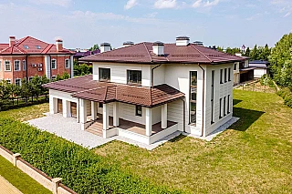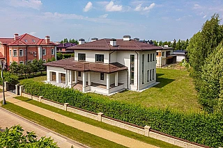 Меблированный дом с привлекательной современной архитектурой в стилистике Ф. Л. Райта, построен из дорогостоящих надёжных материалов, фасадоблицован кирпичом ручной формовки со вставками из лиственницы экстра класса, оснащён передовыми инженерными системами. В доме панорамные окна, 2хсветный холл, пять спален (одна на первом этаже), большая терраса с маркизой, квартира для персонала. Интерьер дома выполнен по авторскому проекту с элегантным сочетанием минимализма и лофта. Дом стоит на зелёном участке с эффектным ландшафтным дизайном в 65 м от леса. Высажены ели, туи, лаванда, шалфей, цветы, газон. Есть автополив, теплый гараж на 2 авто и открытая парковка на 6 автомобилей. Охраняемый коттеджный посёлок с центральными коммуникациями, вблизи полная городская инфраструктура.