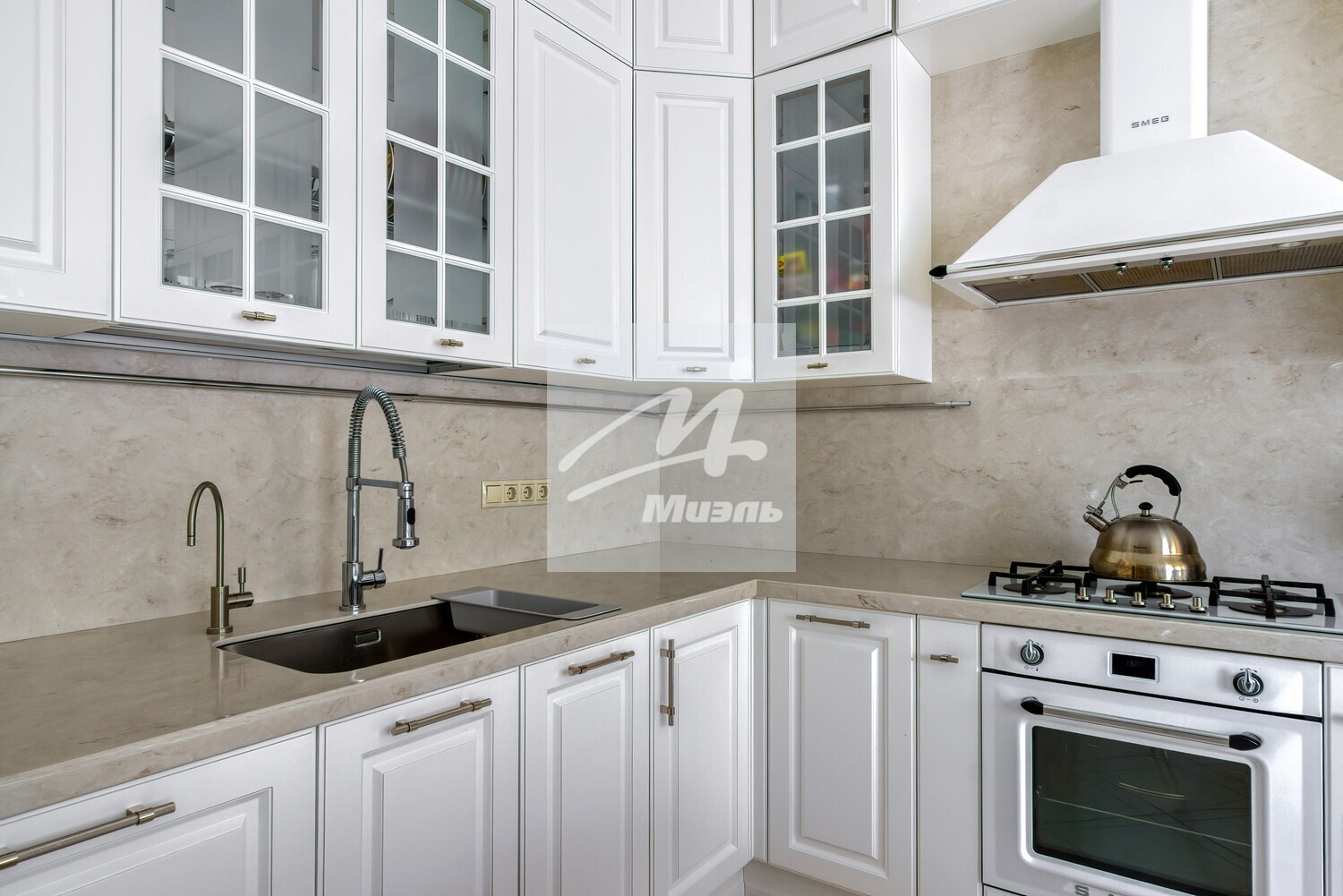 Кухня из массива, оснащенная техникой SMEG (п/м машина, духовой шкаф, варочная панель на 5 конфорок, вытяжка, микроволновая печь), холодильником LG InstaView