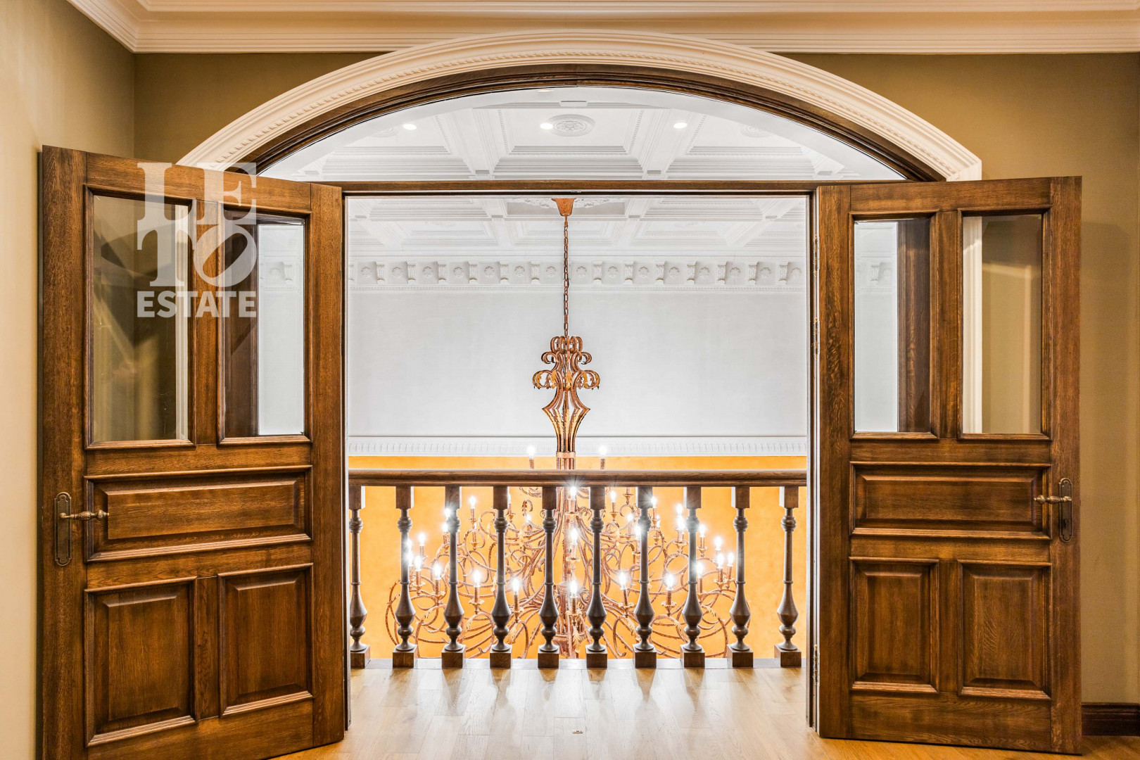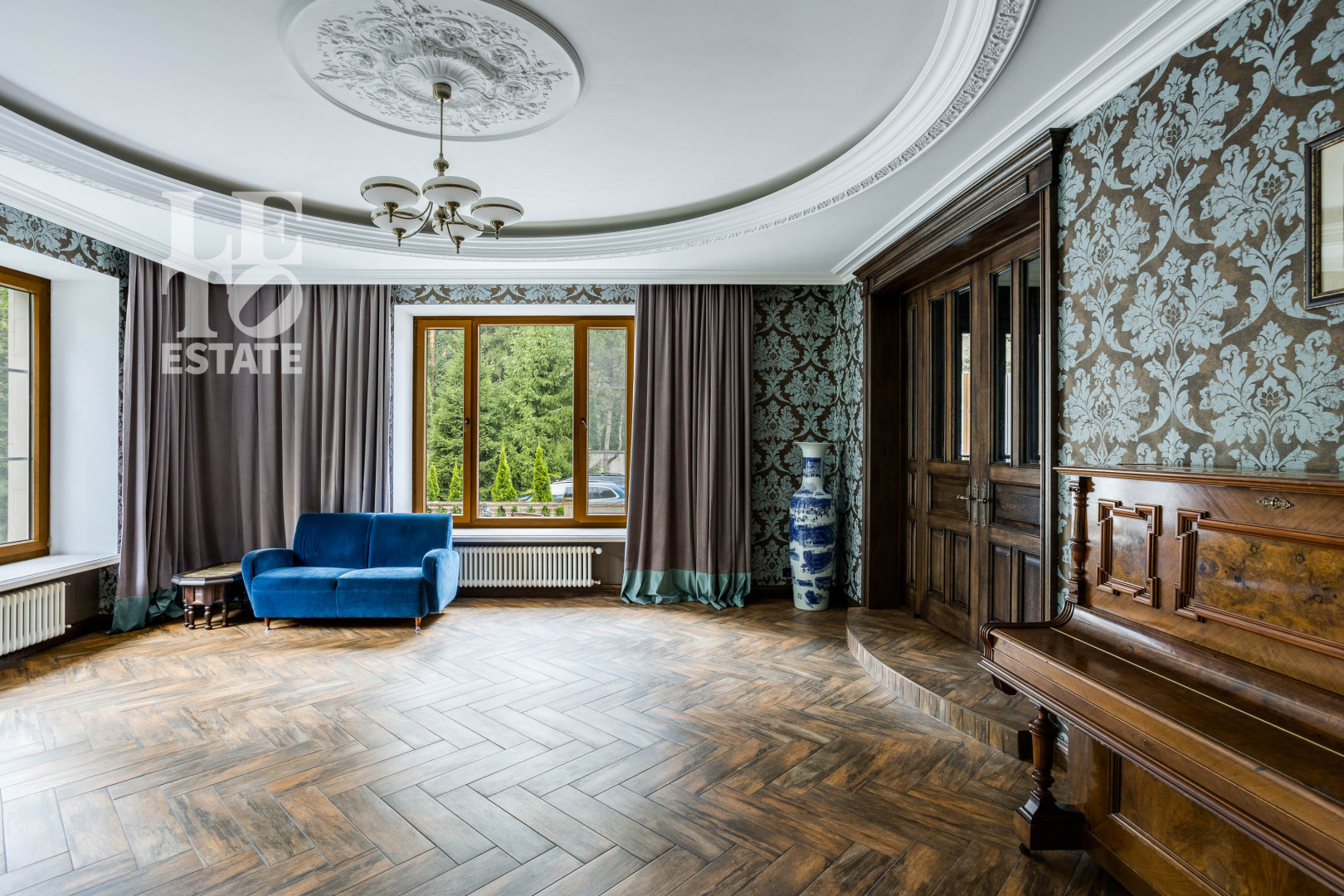 Настоящим сокровищем дома является каминный зал с двойным светом, балконом и коллекционной дворцовой люстрой. Благородная лестница, украшенная резными узорами, подчеркивает стиль и характер особняка. Террасы и балконы открывают роскошные виды на вековой сосновый лес, хвойные и плодовые деревья. Пение птиц, прохлада леса и целебный воздух создают атмосферу спокойствия и умиротворения.