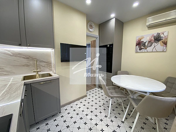 В квартире установлена новая качественная мебель: для сна и отдыха есть двуспальная кровать с ортопедическим матрасом и с дополнительным местом для хранения вещей, есть вместительная, полностью оборудованная гардеробная комната. На кухне установлен гарнитур под единой столешницей и обеденный стол. Кухня оснащена всей необходимой бытовой техникой, в том числе есть холодильник, встроенные варочная панель, духовка, микроволновая печь, посудомоечная машина, вытяжка. В комнате и на кухне установлены кондиционеры и телевизоры. Ванная комната оснащена стиральной и сушильной машинами, установлен бойлер для нагрева воды.