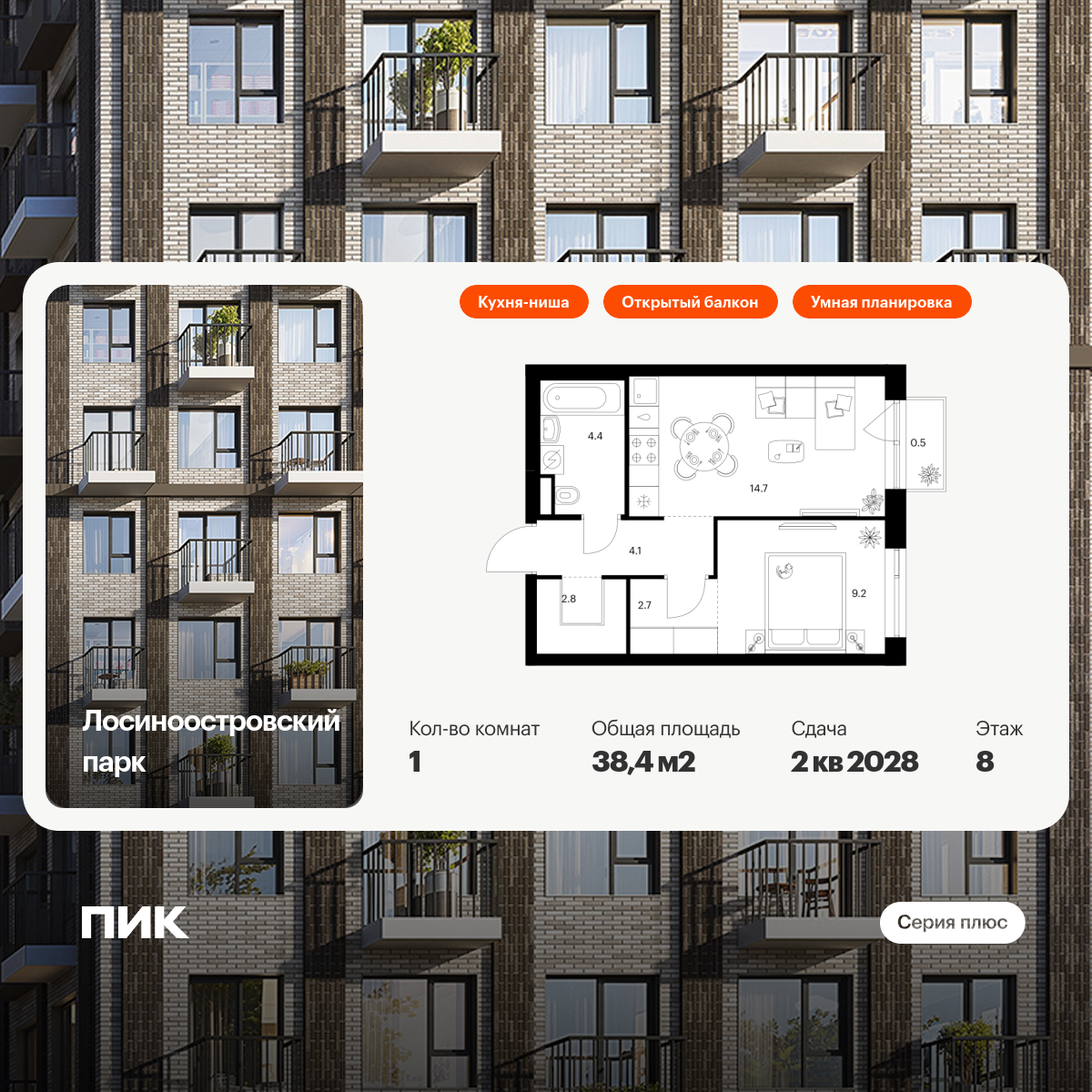 Продаётся 1-комн.квартира площадью 38.40 кв.м на 8 этаже 14 этажного дома (Корпус 2.3, секция 1) проекта ПИК Лосиноостровский парк. Светлый просторный подъезд на уровне земли, функциональная планировка, большие окна.