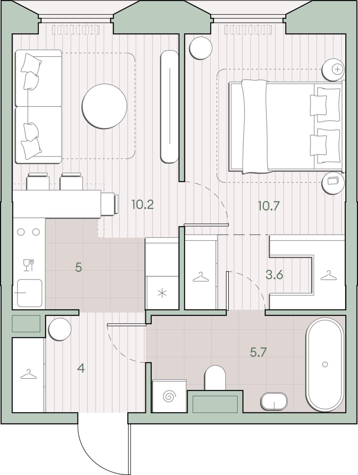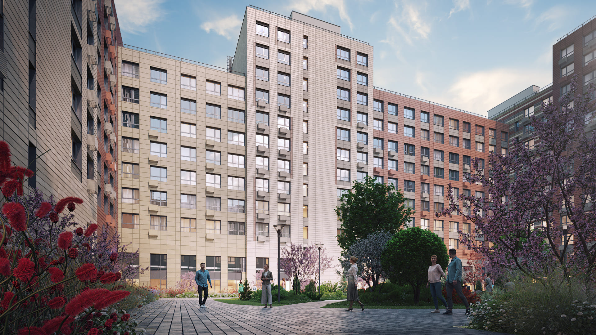 Внутренние дворы со сквозным проходом и общественные пространства соединяют воедино территорию, а богатая инфраструктура первых этажей делает жизнь в комплексе комфортной и разнообразной.