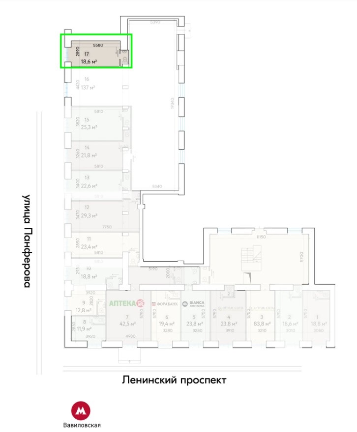 Номер лота на нашем сайте: 44637. Продажа нежилого помещения свободного назначения на первой линии домов улицы Ленинский проспект. Метро "Вавиловская" менее 1 минуты пешком. Отличная пешеходная и транспортная доступность. Помещение общей площадью 18.6 кв. м расположено на первом этаже жилого дома. Высота потолков 4.0 м. Ленинский проспект крупный торговый коридор, формирование которого обеспечили плотная жилая застройка и развитая инфраструктура. Проспект характеризуется высокой концентрацией ритейла, предприятий услуг и общепита. Качественный пешеходный трафик генерируют жилые дома, высшие учебные заведения и крупные бизнес-центры. В IV квартале 2025 г. открывается новая станция метро Вавиловская , входы/выходы из которой будут расположены вдоль Ленинского проспекта, на пересечении с улицами Панферова и Строителей, в нескольких метрах от помещений.