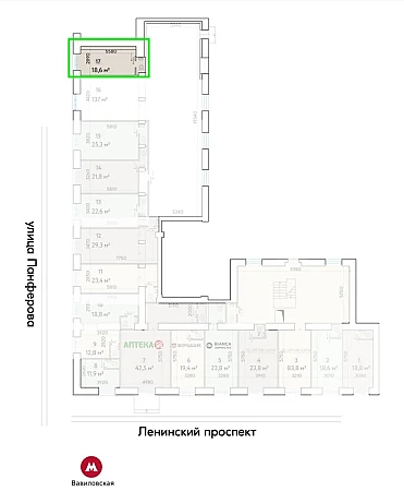 Номер лота на нашем сайте: 44638. Сдается в аренду нежилое помещение свободного назначения на первой линии домов улицы Ленинский проспект. Метро "Вавиловская" менее 1 минуты пешком. Отличная пешеходная и транспортная доступность. Помещение общей площадью 18.6 кв. м расположено на первом этаже жилого дома. Высота потолков 4.0 м. Ленинский проспект крупный торговый коридор, формирование которого обеспечили плотная жилая застройка и развитая инфраструктура. Проспект характеризуется высокой концентрацией ритейла, предприятий услуг и общепита. Качественный пешеходный трафик генерируют жилые дома, высшие учебные заведения и крупные бизнес-центры. В IV квартале 2025 г. открывается новая станция метро Вавиловская , входы/выходы из которой будут расположены вдоль Ленинского проспекта, на пересечении с улицами Панферова и Строителей, в нескольких метрах от помещений.