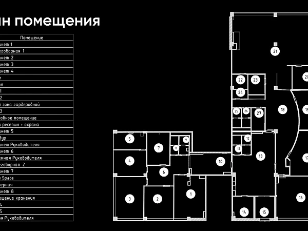 . офисная мебель (кроме кабинета Руководителя), дизайнерские предметы интерьера, обустроенные кухонные зоны, 5 отдельных санузлов, два оборудованных поста охраны.