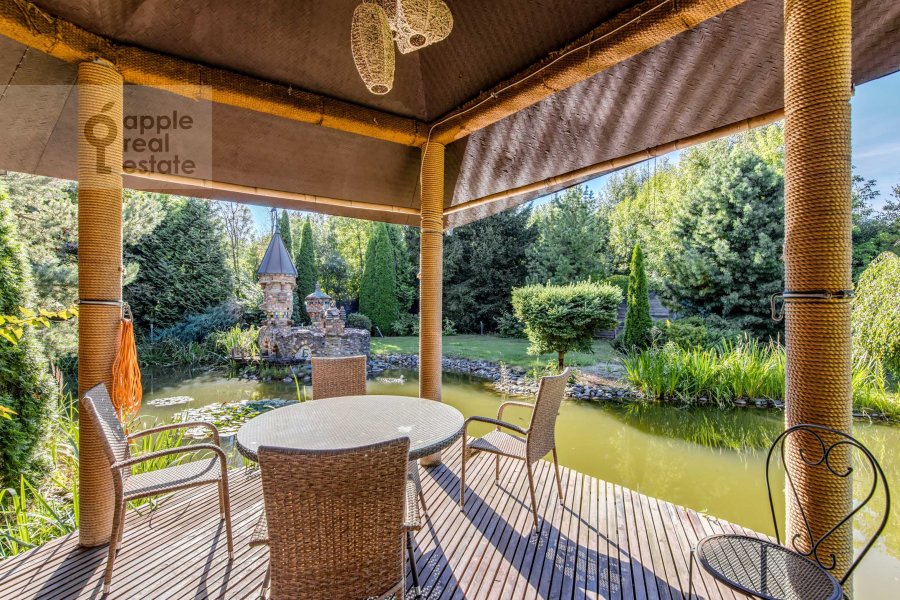 Большой ухоженный участок в 18 соток огорожен сплошным забором. На участке освещение, профессиональный ландшафтный дизайн, лесные деревья, пруд с карпами и своей собственной крепостью, беседка с видом на пруд, зона барбекю, дом для персонала, крытый гараж на 2 машины и открытая парковка на 3 машины.
