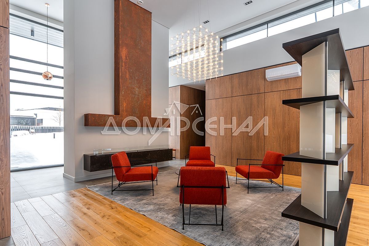 Входная группа с встроенной системой хранения, единое пространство каминного зала и столовой группы с уникальными панорамными видами на лесной массив, далее кухонная зона с островом, барной стойкой и выходом на террасу внутреннего двора, большая гостинная с зоной ТВ и диванной группой, рабочий кабинет или ещё одна жилая комната, две спальни, ванная комната, гостевая комната, топочная с собственным выходом, гостевой санузел, большая постирочная с системой хранения. Левое крыло дома занимает мастер-блок/просторная гардеробная, хозяйская спальня, ванная комната и хамам.