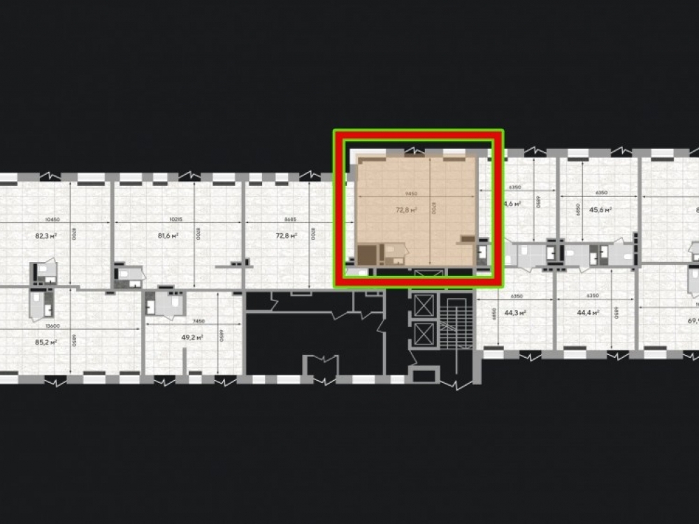. 1 этаж 24-ех этажного аппарткомплекса бизнес-класса, площадью 72,8 м². Витринные окна, зальная планировка. Электрическая мощность 18 кВт. Высота потолков 4.5 м.