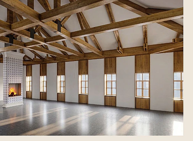 Открытая стропильная система кровли, двери и окна из массива дуба
