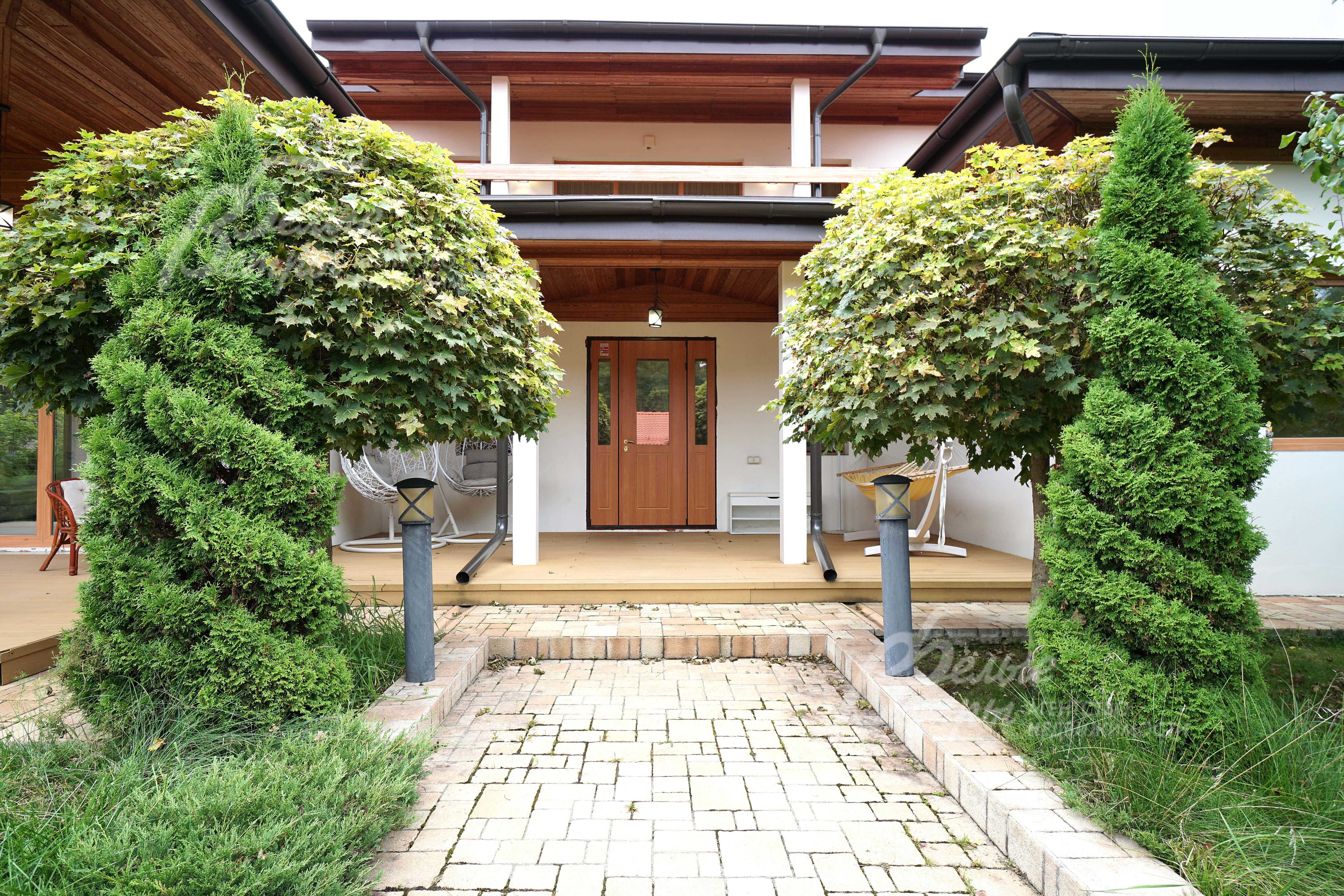 Меблированный дом, построенный по индивидуальному проекту в средиземноморском стиле с высокотехнологичными инженерными коммуникациями. В доме центральная система вентиляции с кондиционированием и увлажнением, воздушное отопление, дополнительно к центральным коммуникациям автономные электропитание и водоснабжение (скважина). Архитектурное решение включает панорамные окна, второй свет, балкон и патио с видом на лес, 4 спальни на 1-м этаже. Выполнена дизайнерская отделка с парящей лестницей и камином. На участке стоит сервисный дом с гаражом и домик для персонала, баня с зоной барбекю и парной, обшитой абашем. Дом расположен на двухуровневом прилесном участке с парковым ландшафтом с лесными и плодовыми деревьями, кустарниками, габионом, просторной парковкой.