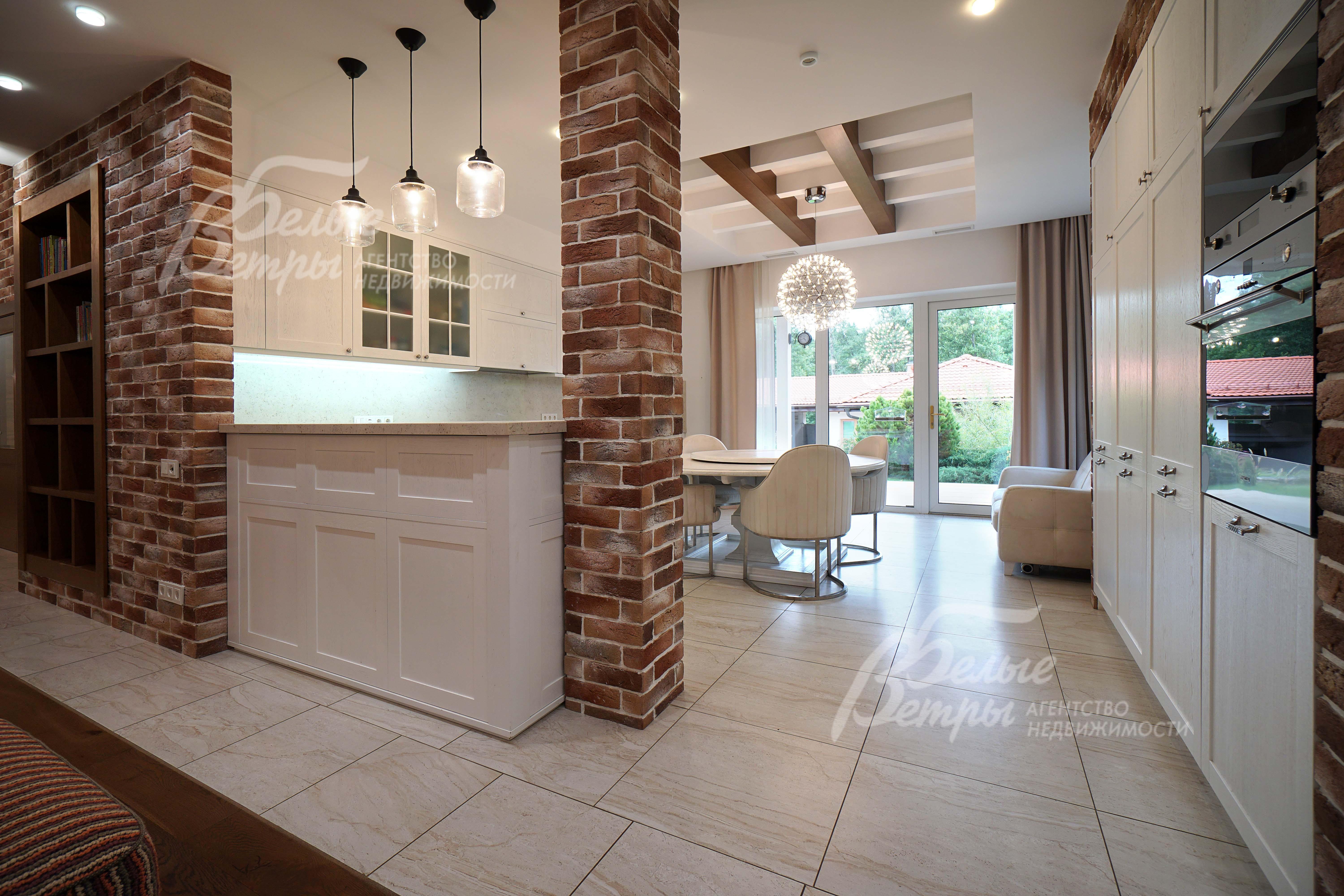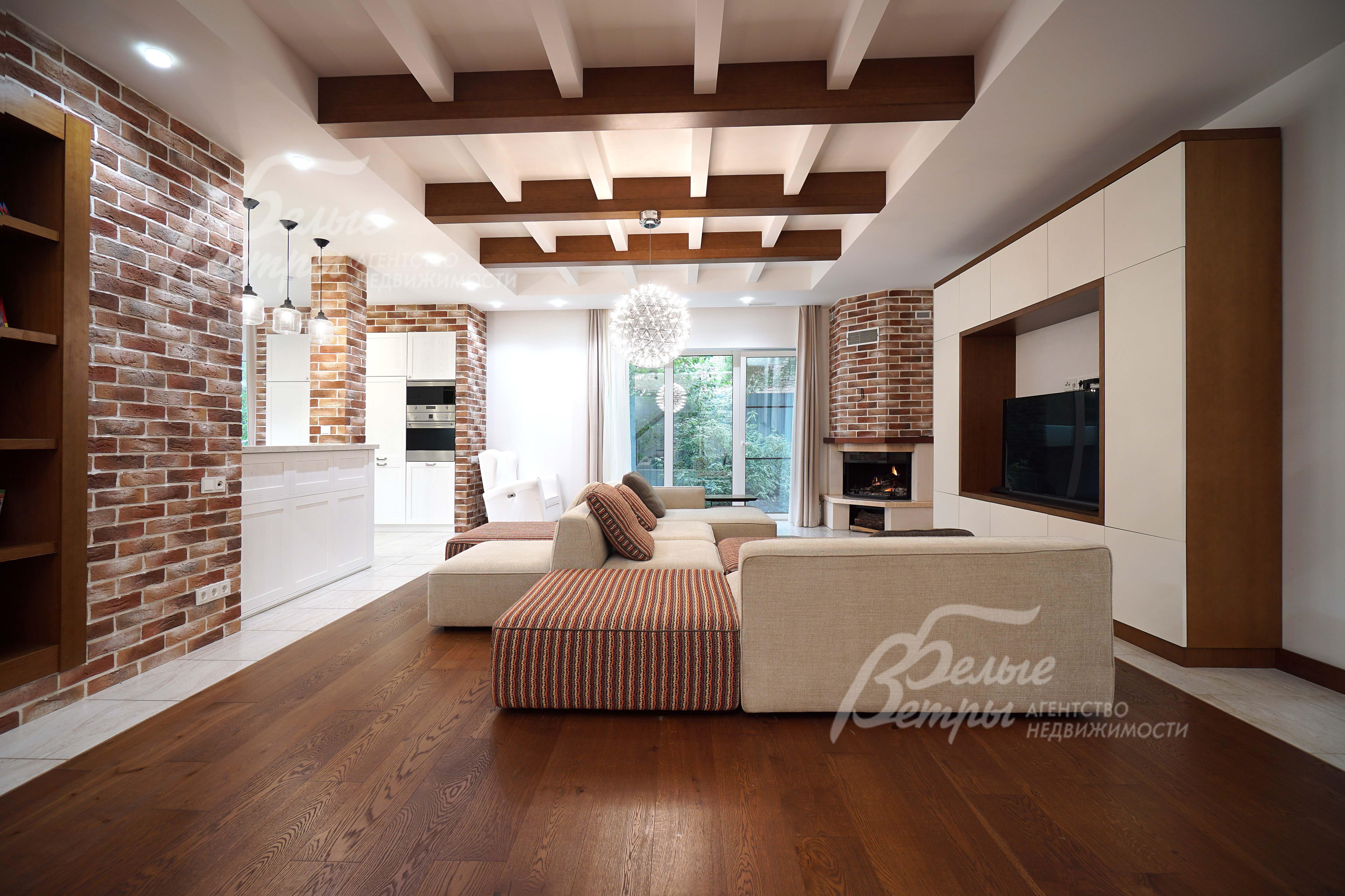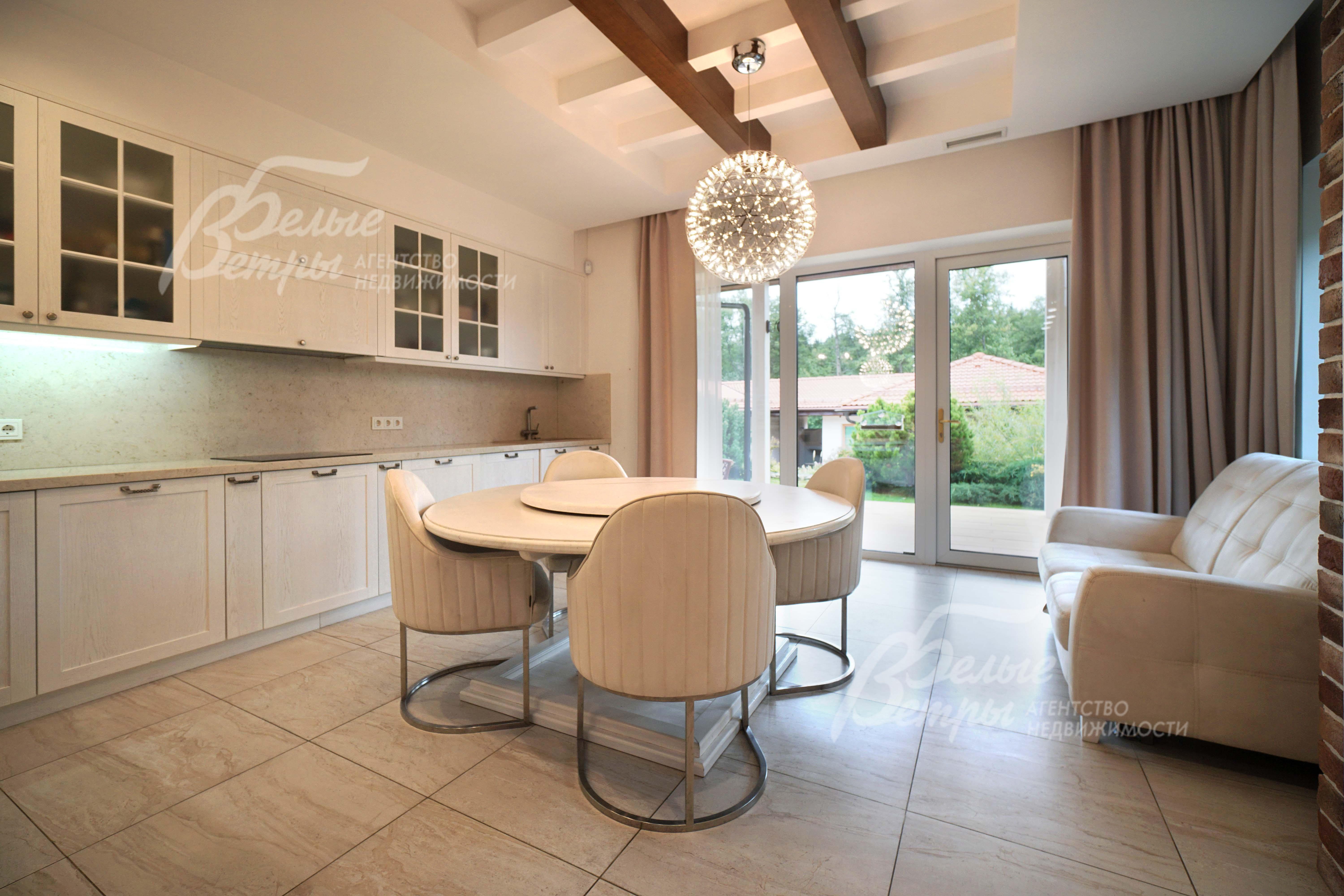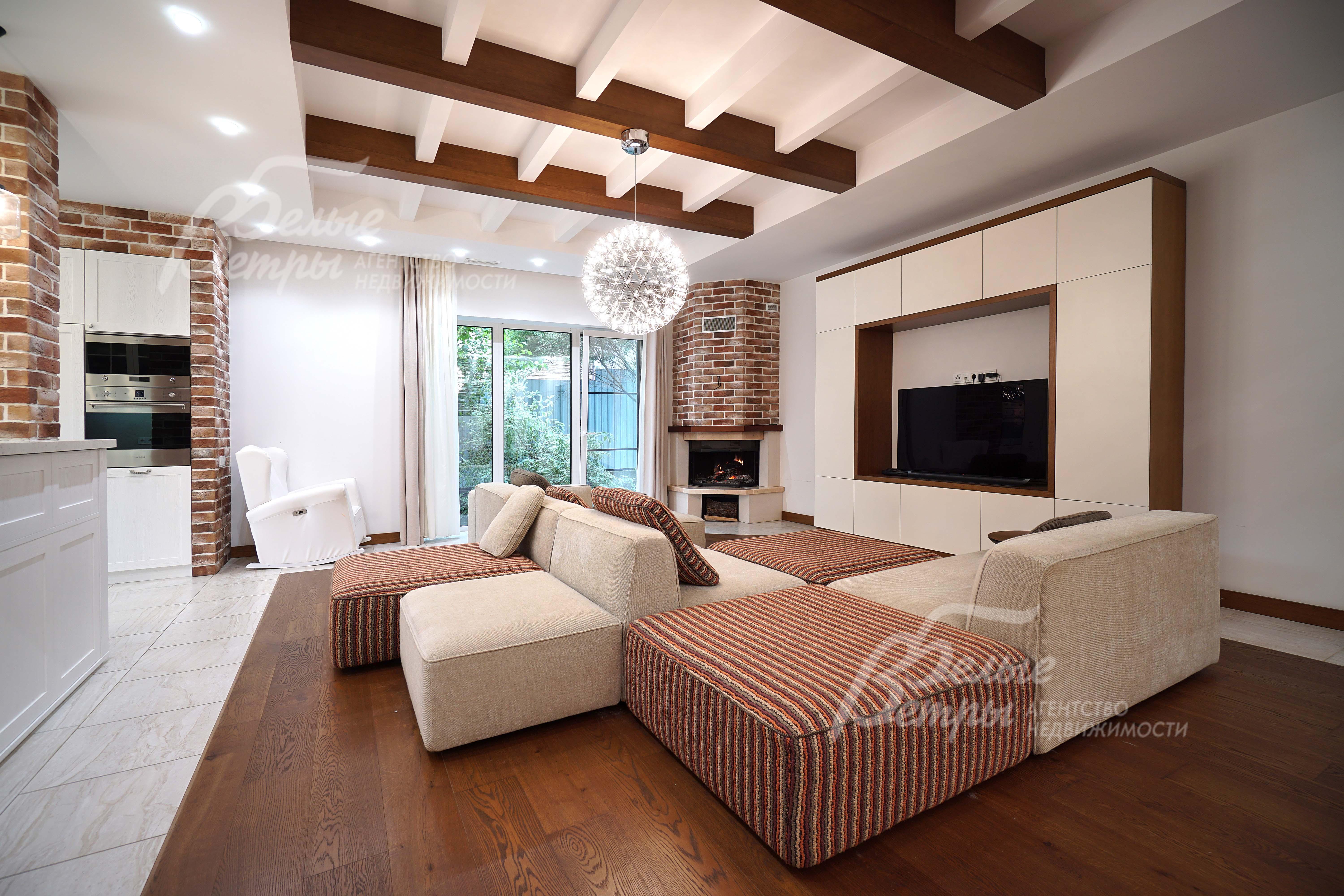 Мебель, оборудование: на кухне: гарнитур с барной стойкой по индивидуальному проекту со встраиваемой техникой Smeg и столешницей из искусственного камня. В гостиной – дорогостоящая диванная модульная группа с антиаллергенными тканями (Италия). Все спальни меблированы гарнитурами. Интерьер украшают люстры и светильники, шторы и жалюзи, камин в гостиной. В санузлах - сантехника Villeroy Boch, смесители Hansgrohe.