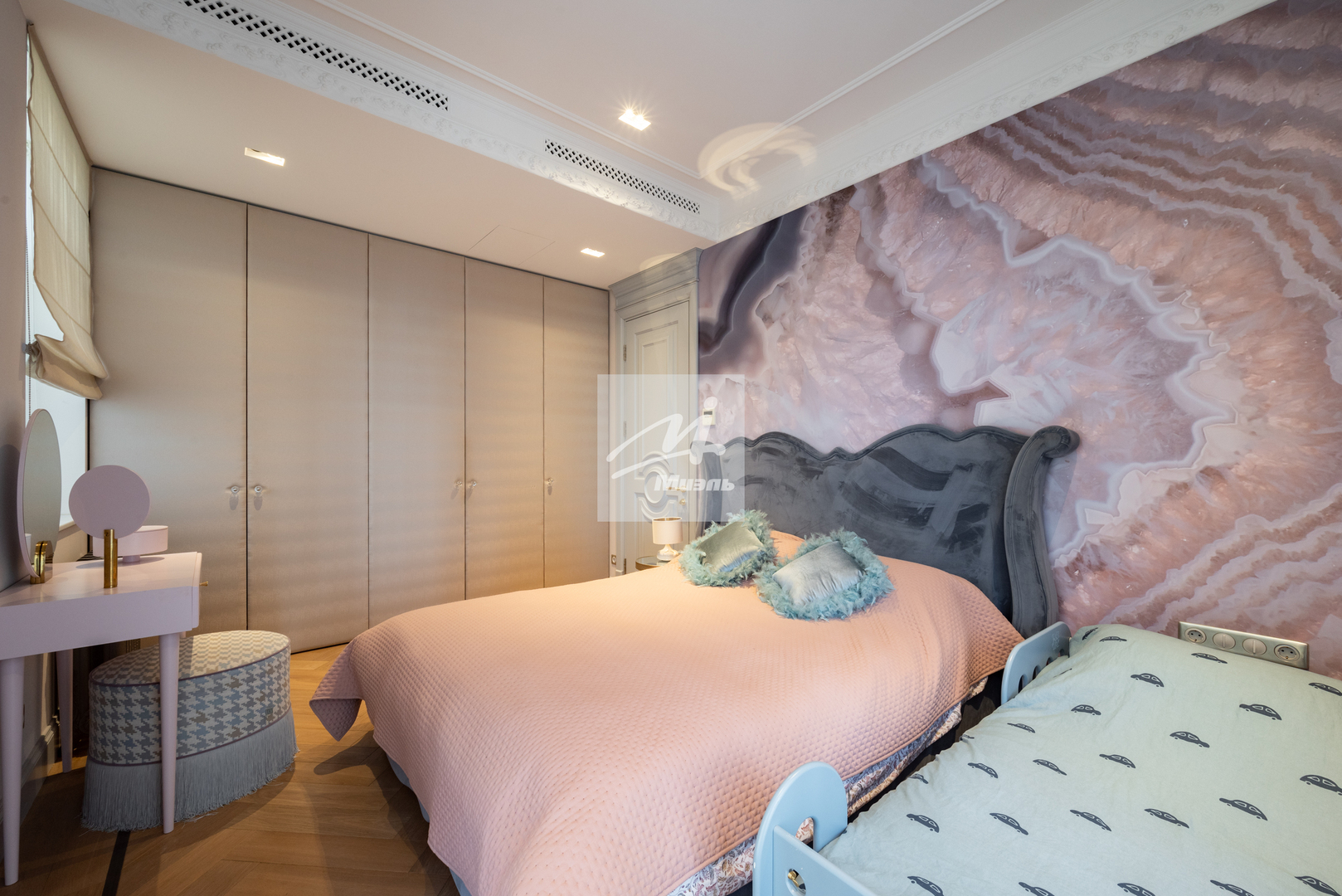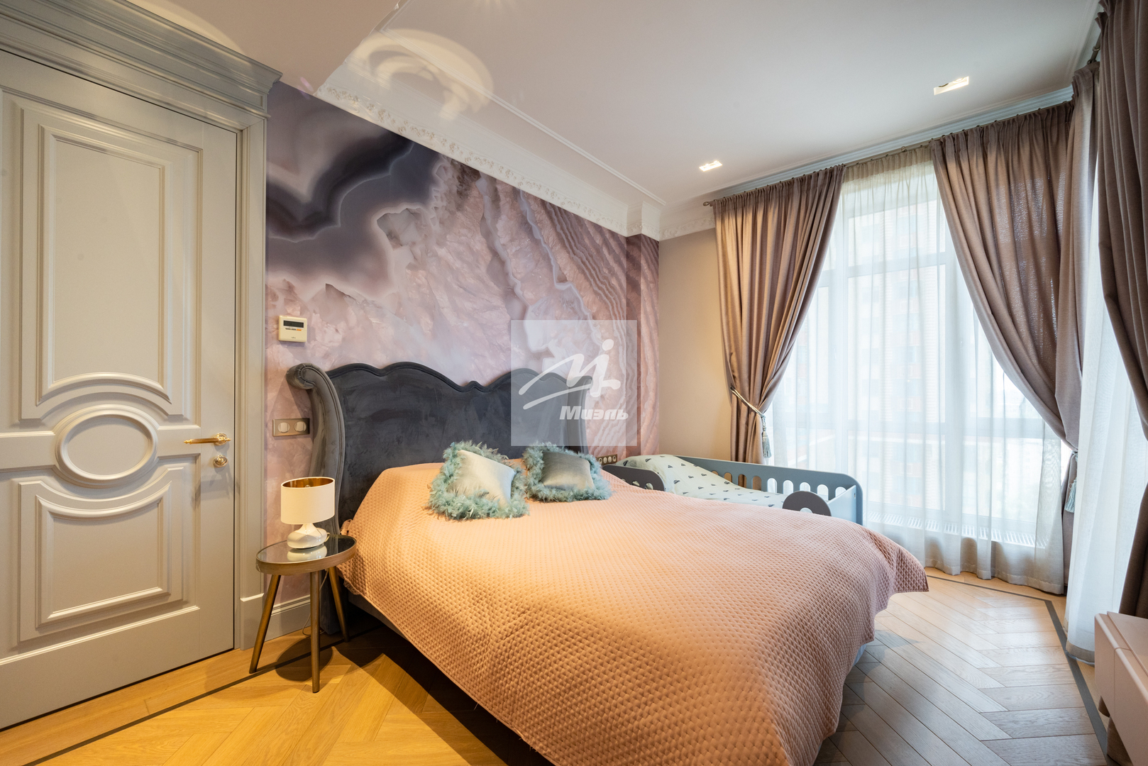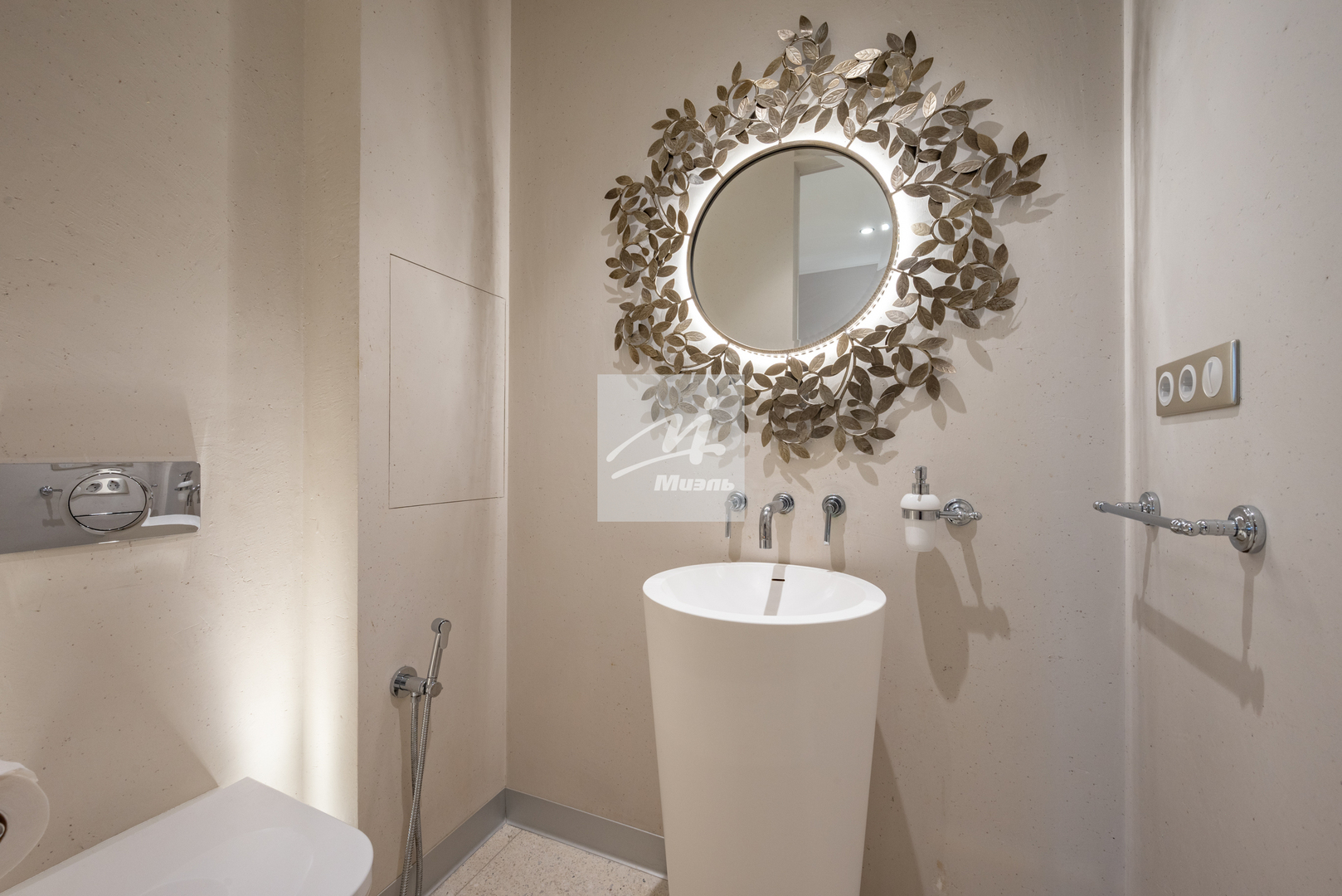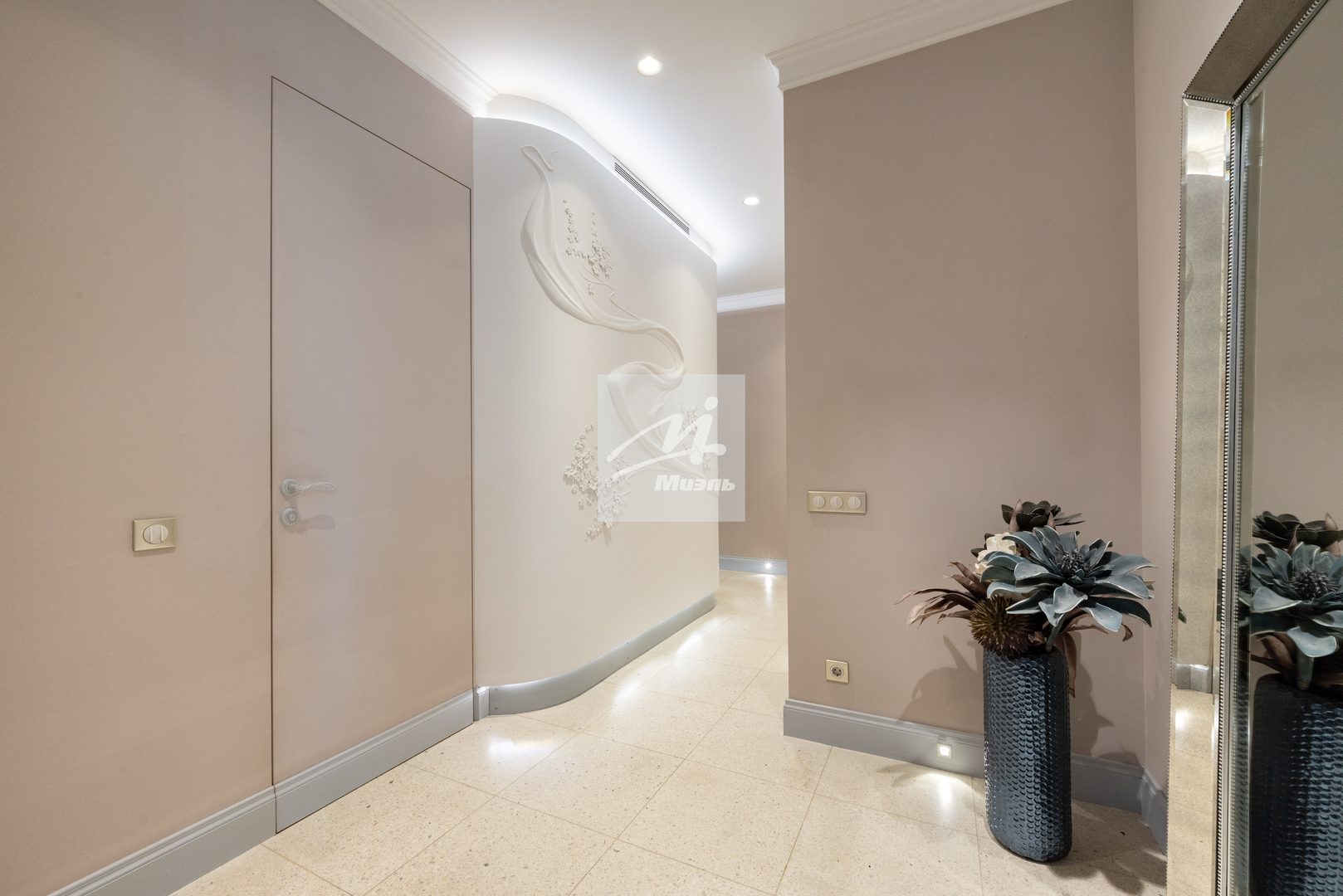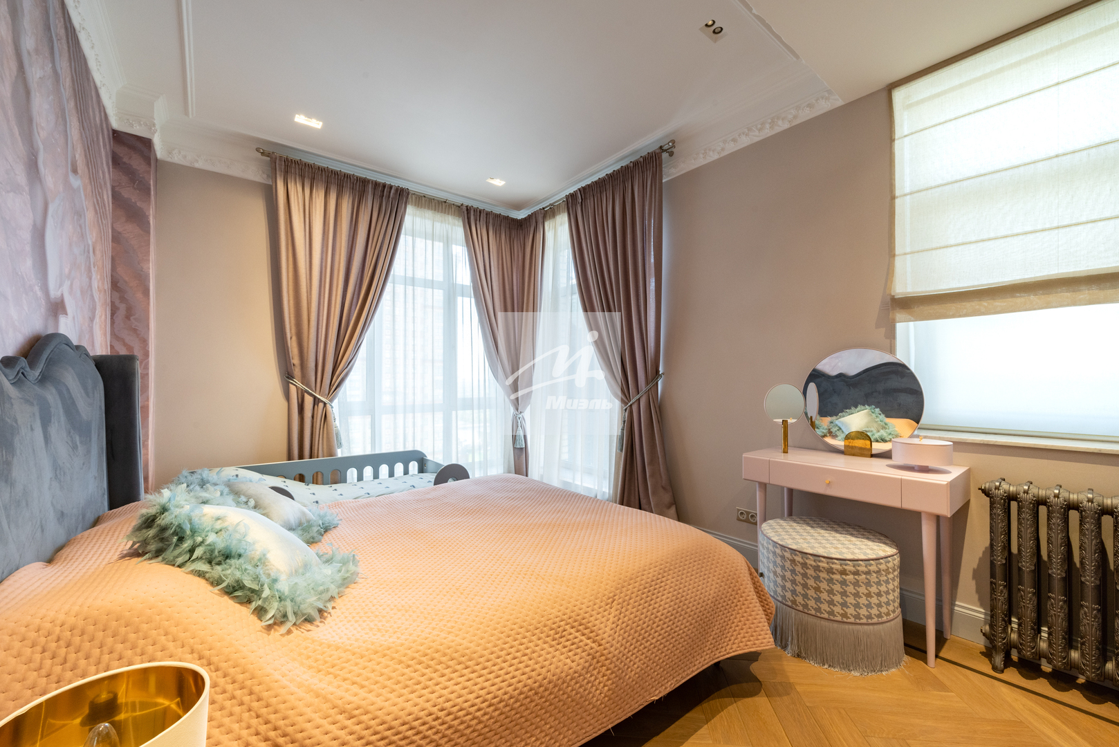 Стены оформлены стильной авторской гипсовой лепниной, на полу дубовый паркет и плитка с подогревом.