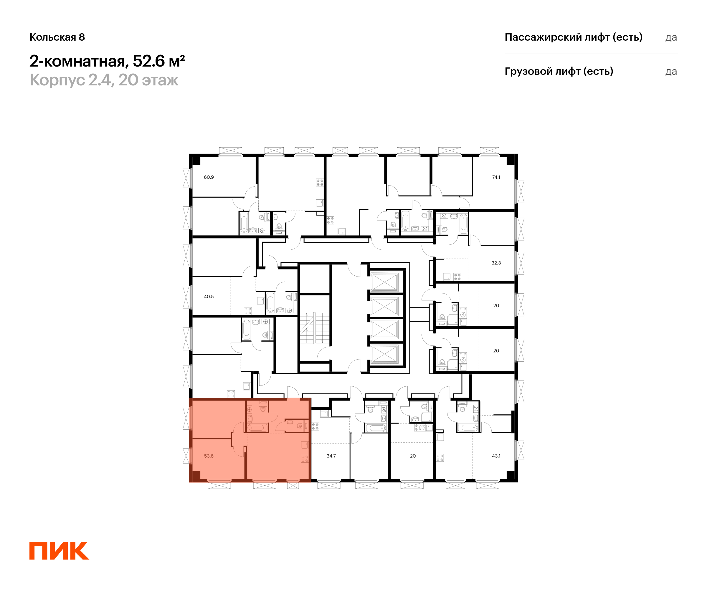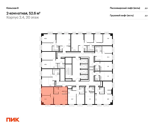 Продаётся 2-комн.квартира площадью 52.60 кв.м на 20 этаже 33 этажного дома (Корпус 2.4, секция 1) проекта ПИК Кольская 8. Светлый просторный подъезд на уровне земли, функциональная планировка, большие окна, с отделкой.
