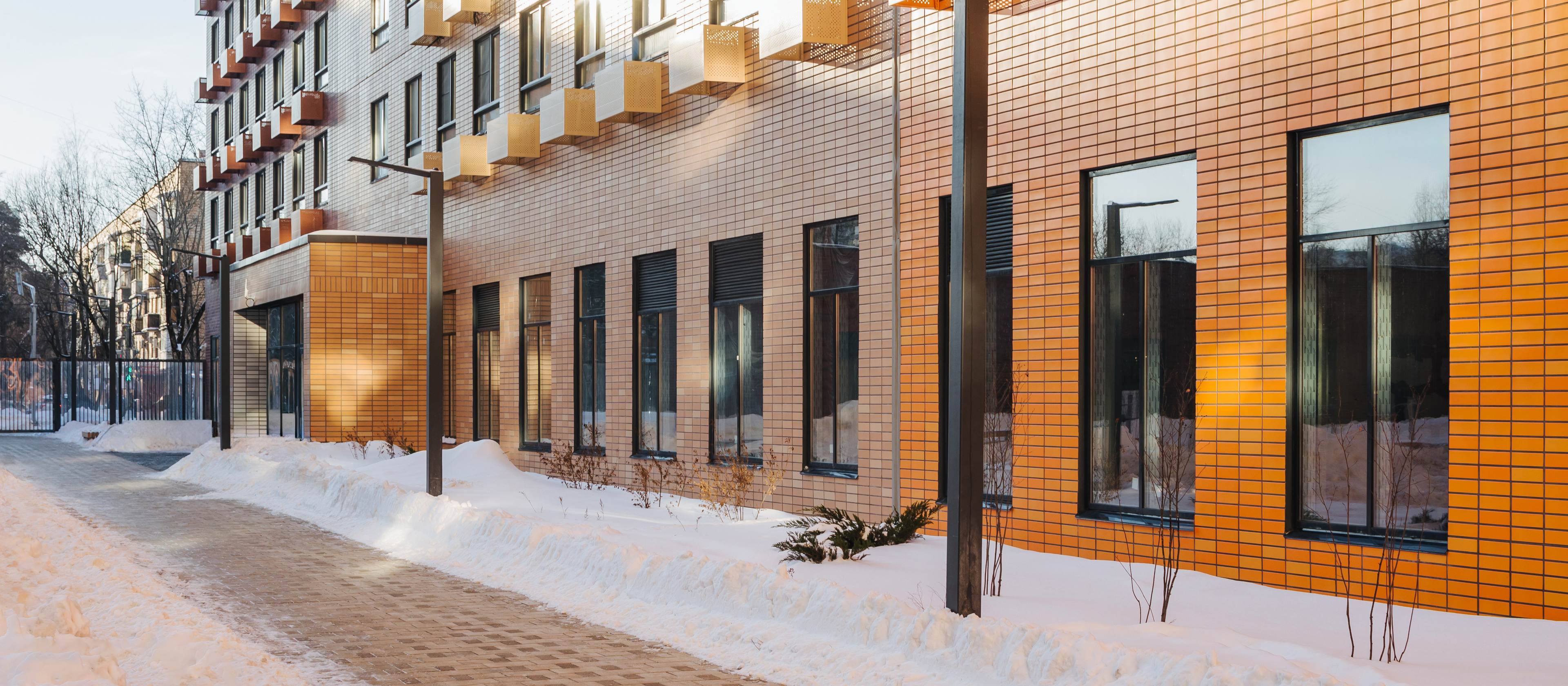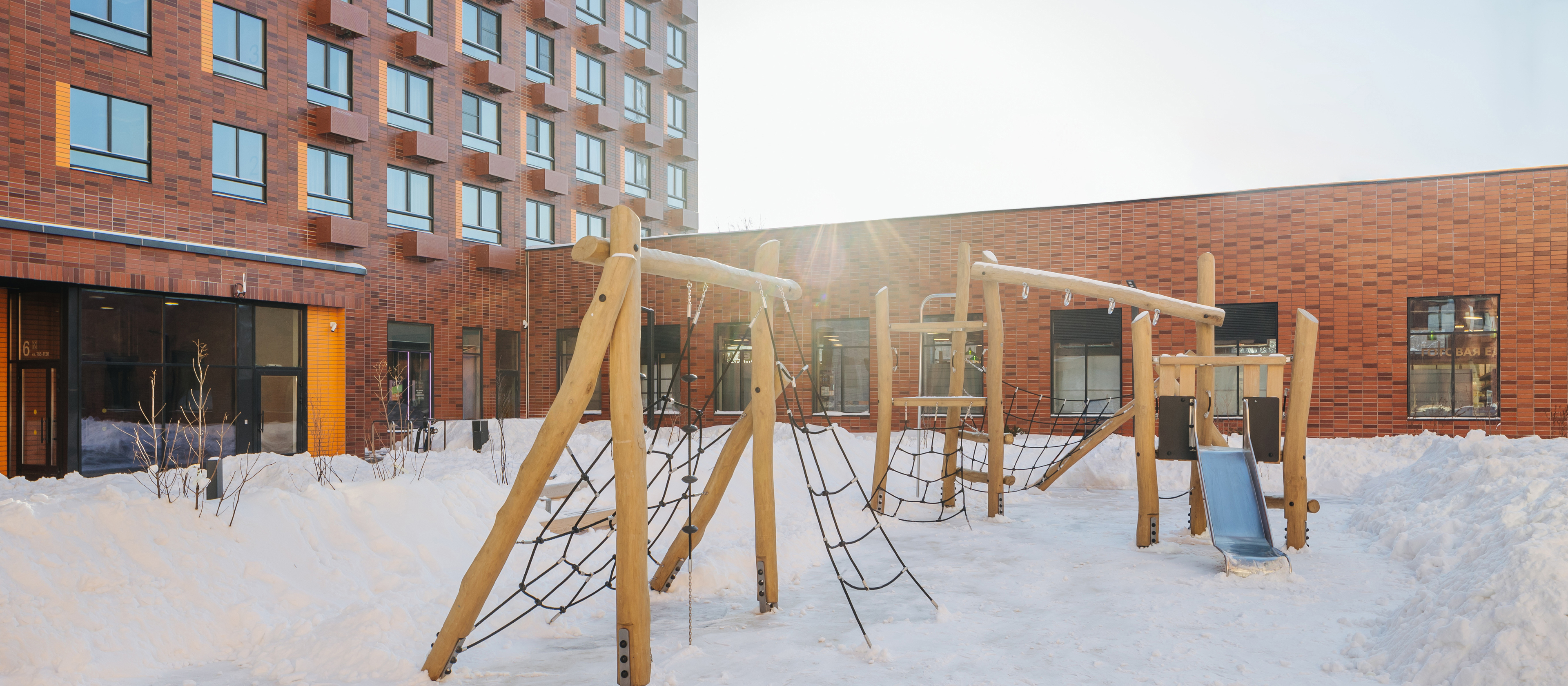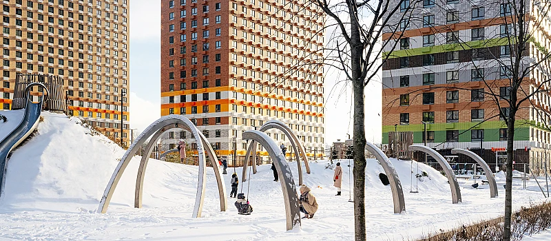 В проекте два жилых блока с подземными паркингами, школа и детский сад. В зелёных дворах-парках будут места для отдыха, современные детские и спортивные площадки. На первых этажах откроются магазины, кафе и другие сервисы — за кофе и свежим хлебом к завтраку можно будет просто спуститься на лифте.